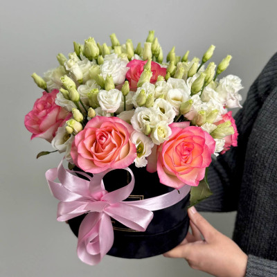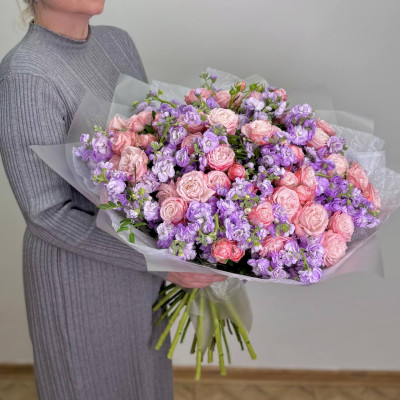 Роза «Эквадор Пинк Мондиаль» — 15 шт., маттиола кусовая фиолетовая — 10 шт., маттиола кусовая розовая — 10 шт., эустома «Алиса Пинк» — 10 шт., роза пионовидная кустовая «Мадам Бомбастик» — 15 шт., гортензия фиолетовая — 4 шт., антуриум белый — 2 шт., копье — 2 шт., роза «Миритим» — 10 шт., корзина белая большая, флористическая губка, атласная лента.