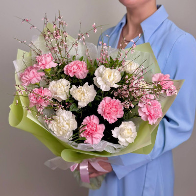 Гвоздика микс — 15 шт., Гениста — 3 шт., зелень, фирменная упаковка, атласная лента.