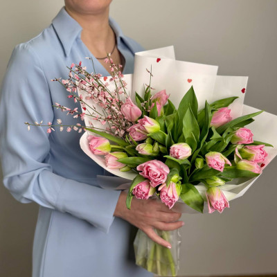 Тюльпан пионовидный — 35 шт., хамелациум — 5 шт., фирменная упаковка, атласная лента.
