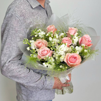 Маттиола белая — 5 шт., роза «Эквадор» — 7 шт., паникум — 5 шт., зелень, фирменная упаковка, атласная лента.