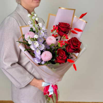 Дельфиниум голубой — 2 шт., хризантема «Момоко» — 3 шт., роза «Россия Ред Наоми» — 3 шт., лагурус красный — 5 шт., гиперикум красный — 1 шт., зелень, фирменная упаковка, атласная лента.