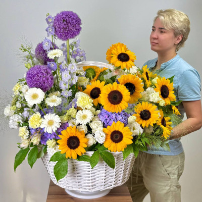 Подсолнух — 21 шт., гортензия фиолетовая «Галандия» — 4 шт., эустома «Алиса Вайт» — 10 шт., дельфиниум голубой — 7 шт., гермини белая — 15 шт., паникум — 15 шт., аллиум фиолетовый — 3 шт., серурия — 10 шт., диантус (гвоздика) желтый — 15 шт., зелень, корзина, флористическая губка.