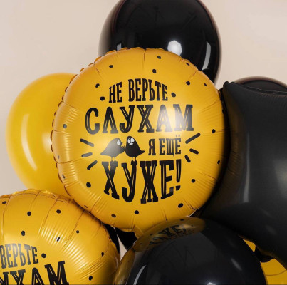 В центре ансамбля — фольгированный шар «Звезда», притягивающий взгляд своим геометрическим совершенством и глянцевым блеском. Рядом — не менее эффектный фольгированный круг с провокационной надписью «Не верьте слухам, я ещё хуже»: эта деталь придаёт композиции характер, превращая её в своеобразный манифест лёгкого отношения к жизни.