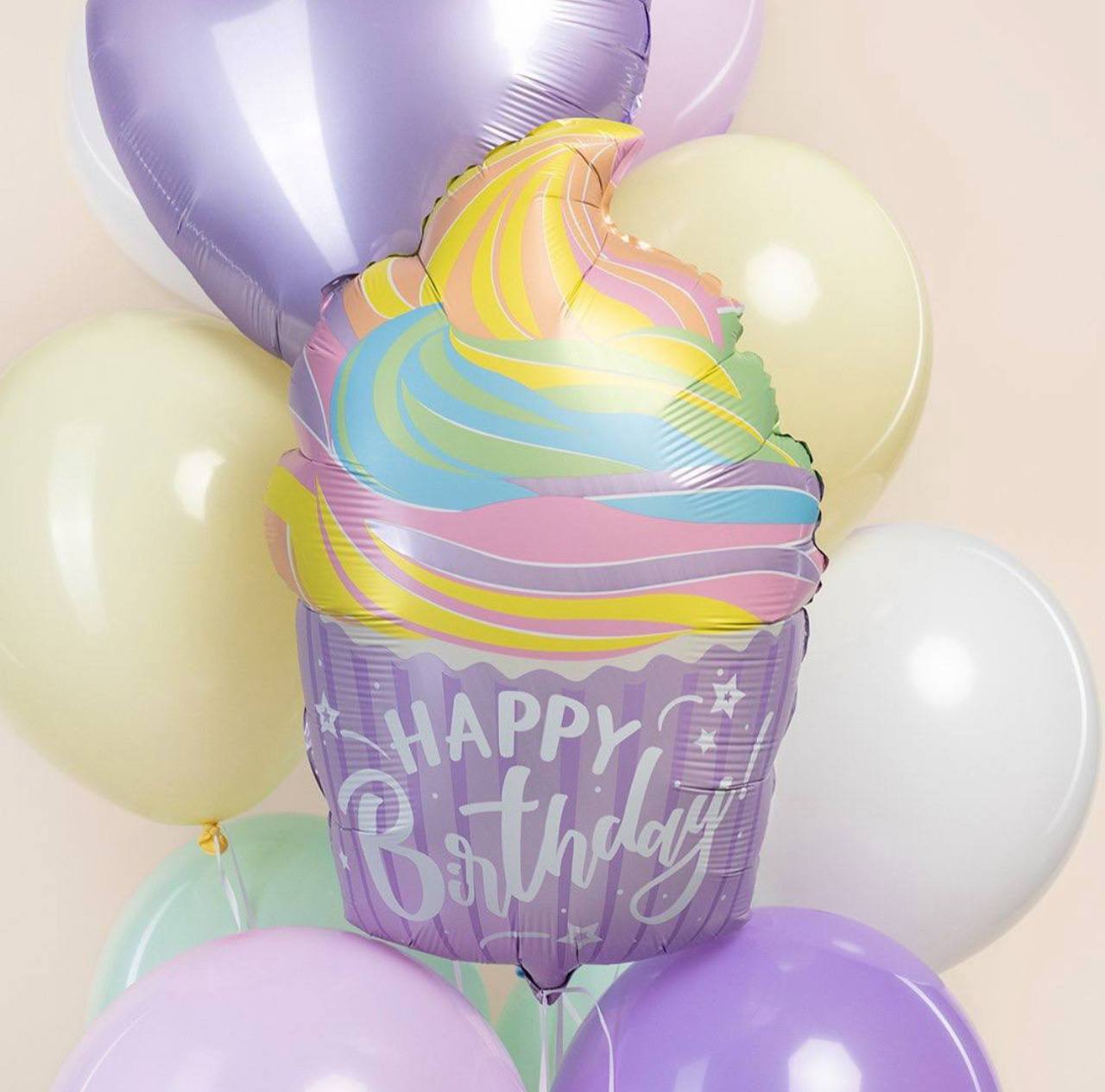 Фольгированный шар «Кекс» «С днем рождения» — 1 шт., фольгированный шар «Сердце» — 1 шт., латекс «Пудра микс» — 9 шт., лента, грузик.