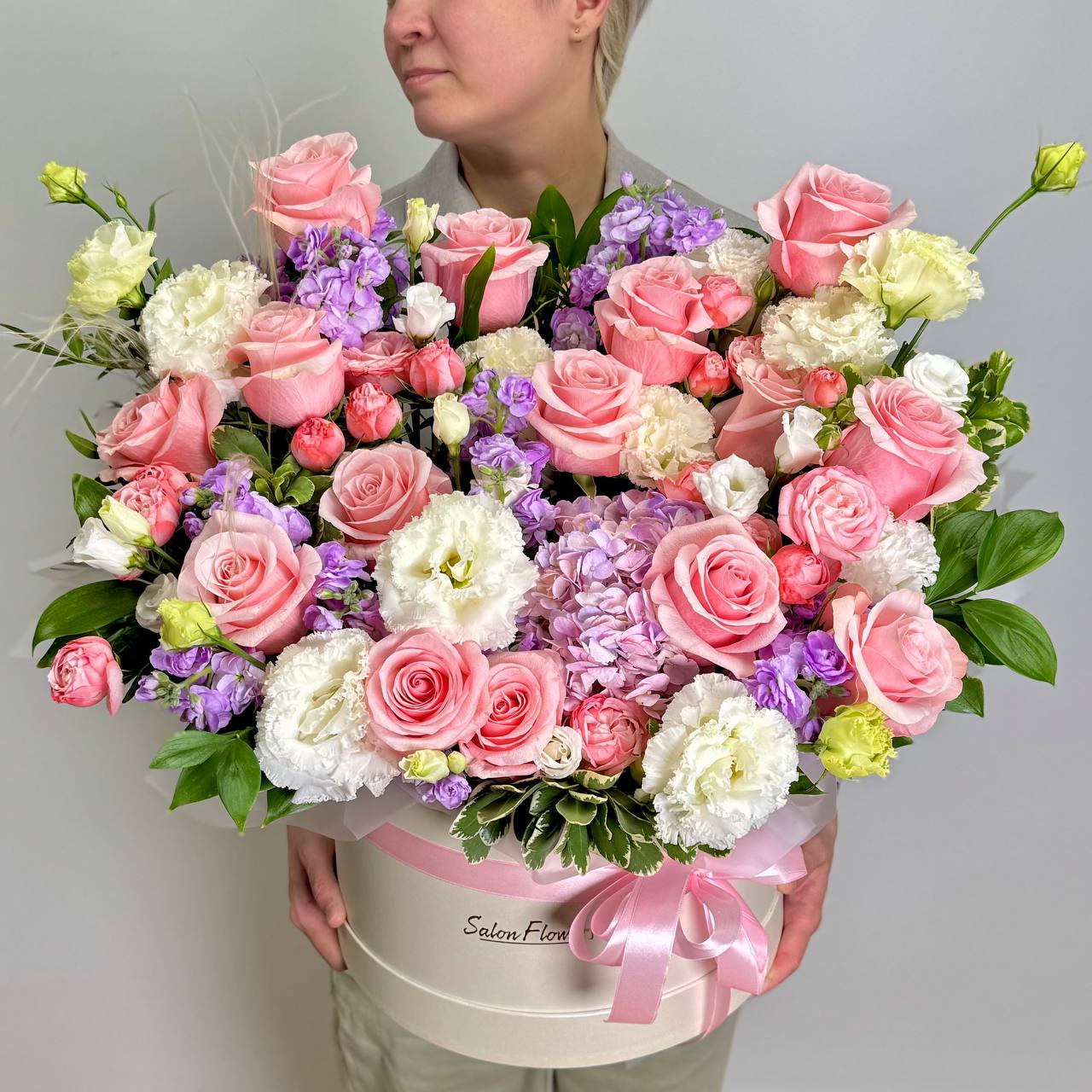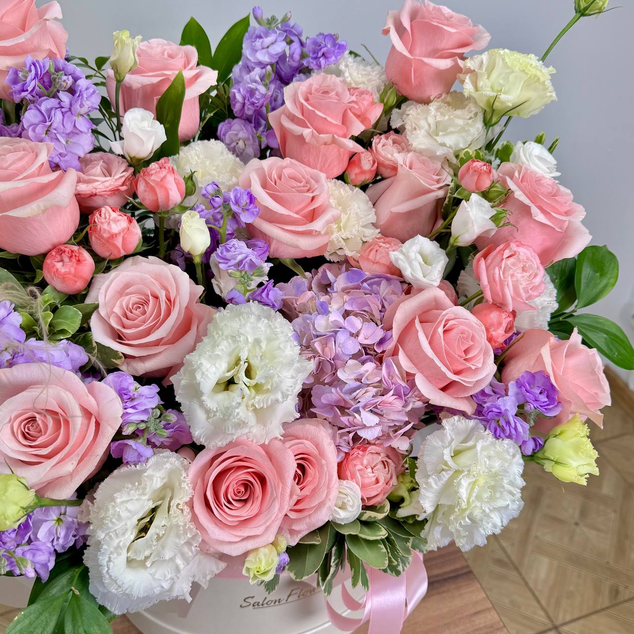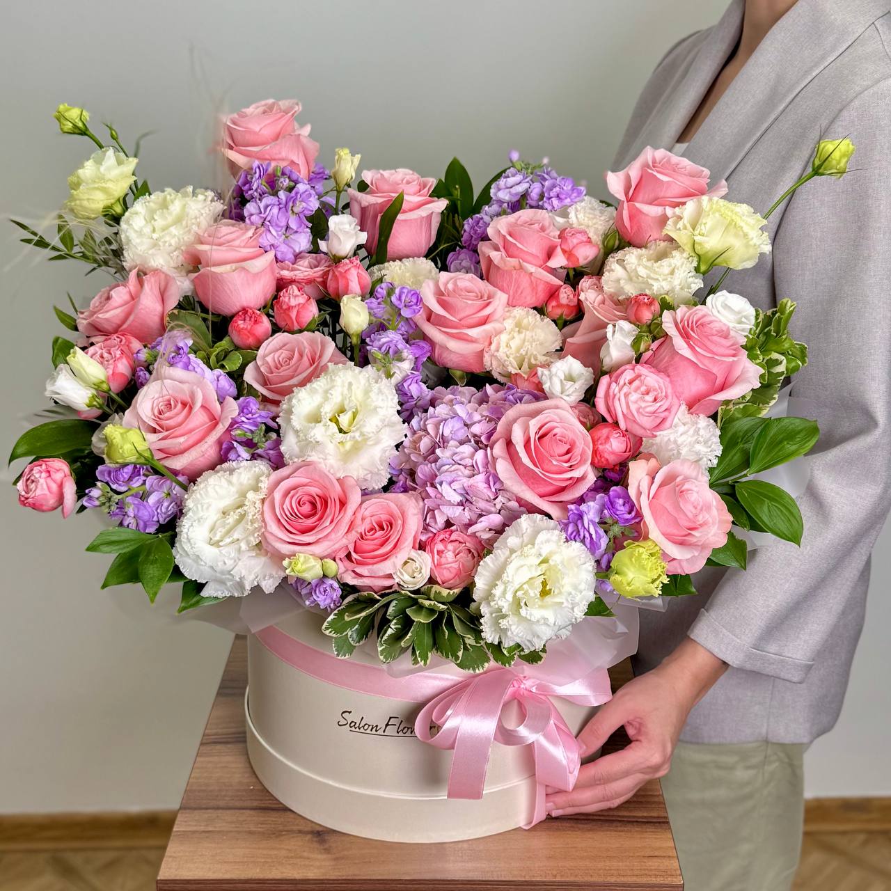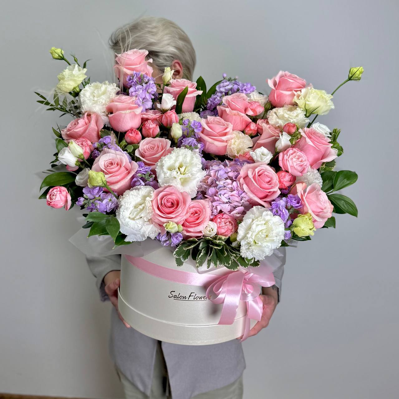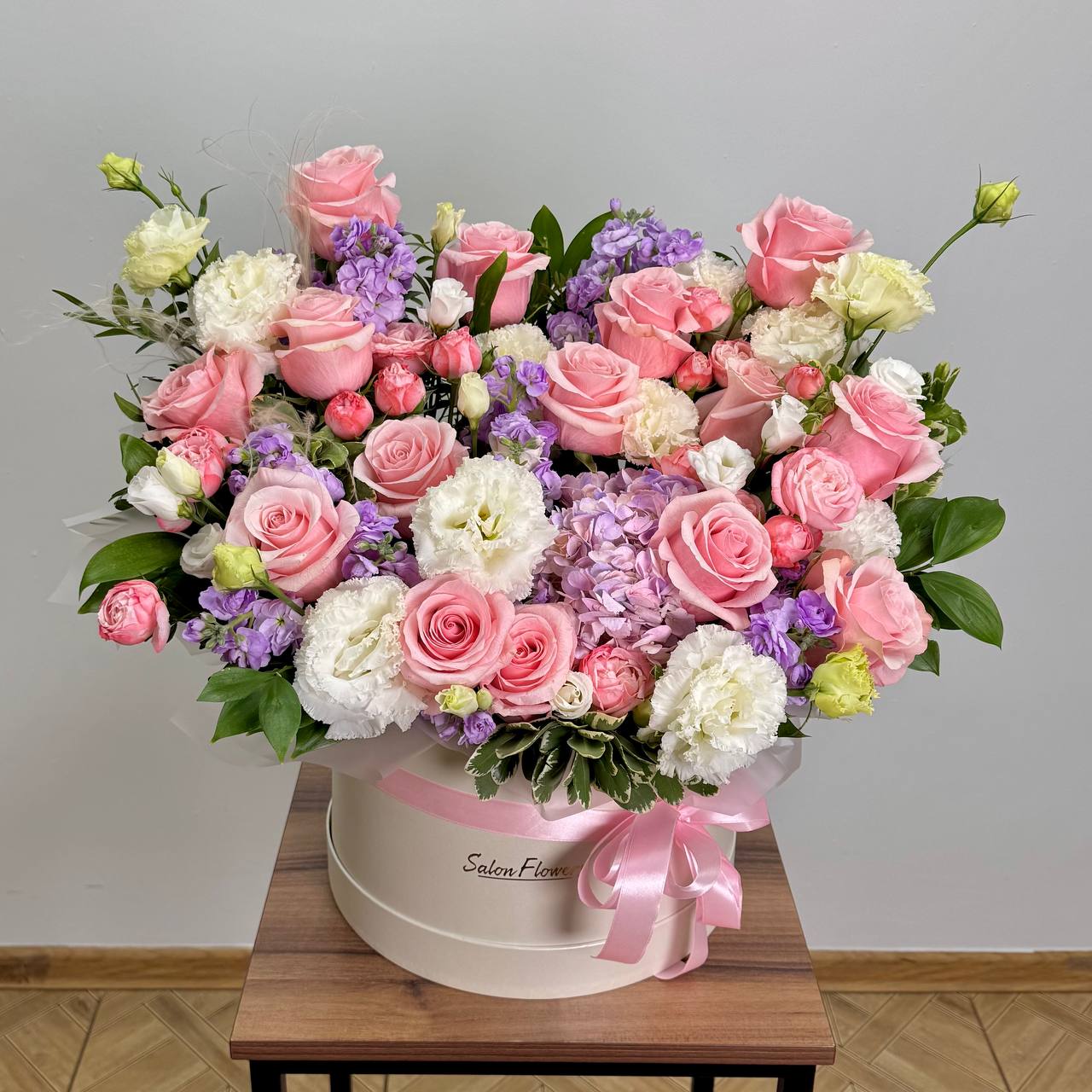 Всё это великолепие бережно размещено в шляпной коробке размером 30 × 20 см, дополненной изящной юбочкой. Флористическая губка надёжно удерживает цветы, сохраняя их свежесть, а атласная лента мягко обвивает композицию, придавая ей завершённость и ноту аристократической сдержанности.