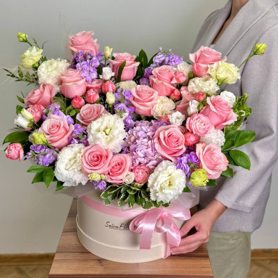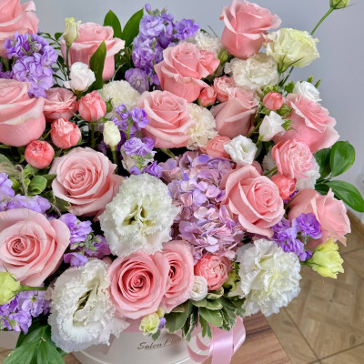 Роза «Ангажемент Эквадор» — 15 шт., эустома «Алиса Вайт» — 5 шт., роза кустовая пионовидная «Мадам Бомбастик» — 5 шт., маттиола кустовая лавандовая — 5 шт., гортензия «Калумбия» — 1 шт., рускус, зелень, шляпная коробка 30х20 см., юбочка, флористическая губка, атласная лента.