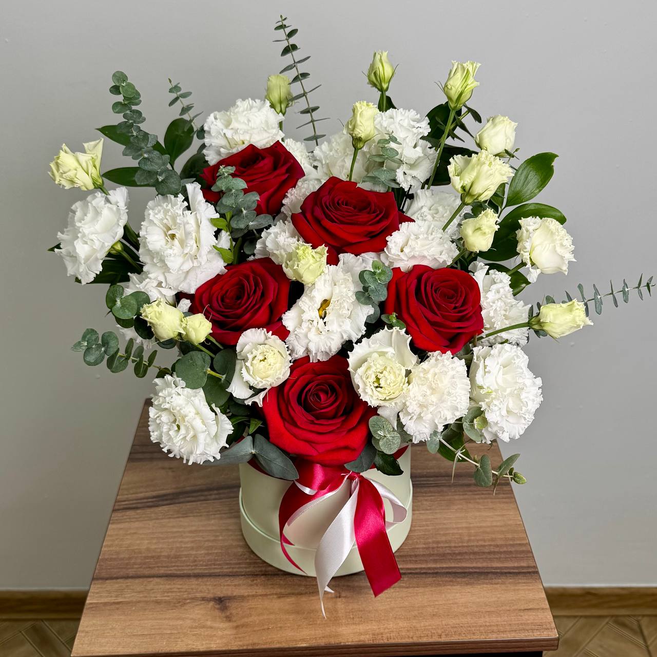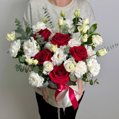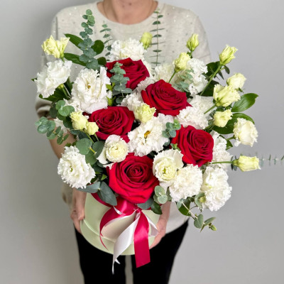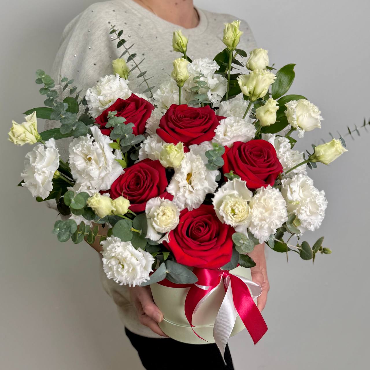 Роза «Россия Ред Наоми» — 5 шт., эустома «Алиса Вайт» — 5 шт., эвкалипт, шляпная коробка 15х15 см., юбочка, флористическая губка, атласная лента.