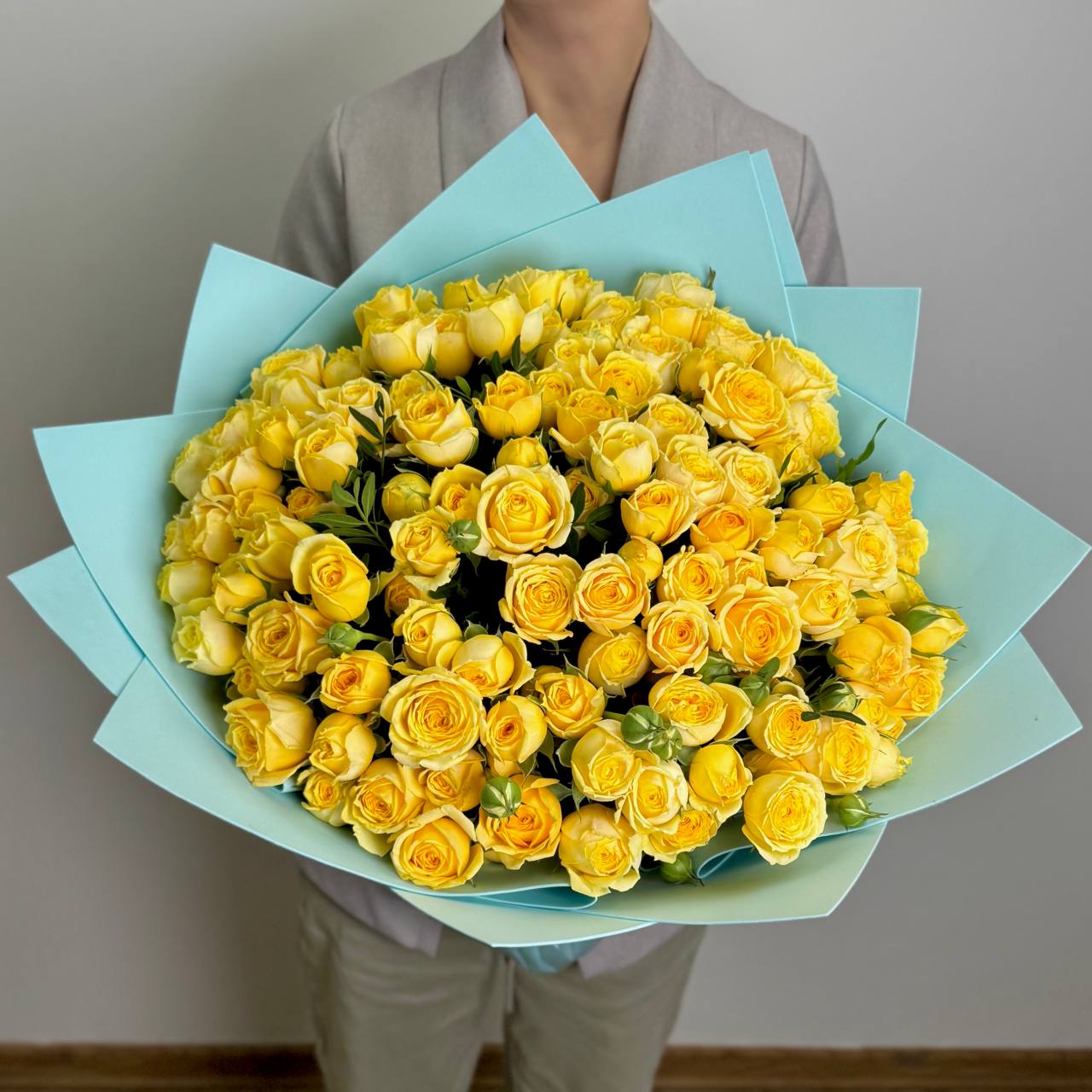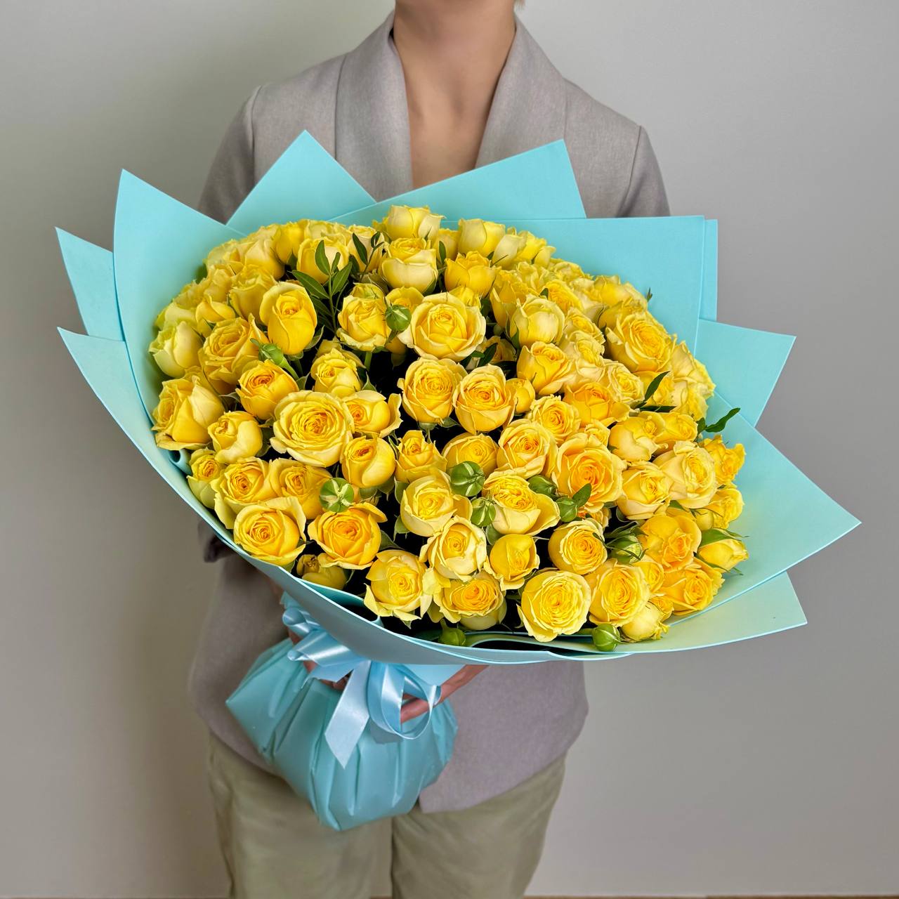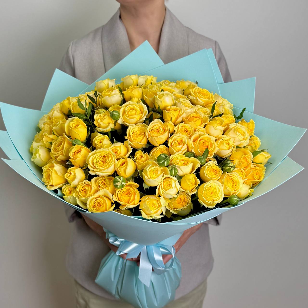 Роза кустовая пионовидная "Еллоу Баблс" – 29 шт., зелень, фирменная упаковка, атласная лента.