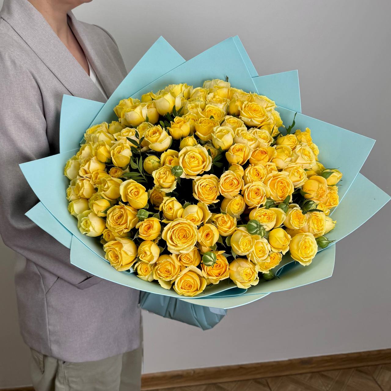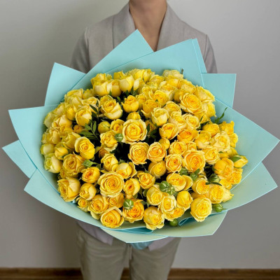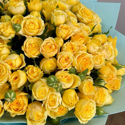 Букет «Кустовые розы Арт» — изысканная ода природной красоте, воплощённая в 29 соцветиях пионовидной розы «Еллоу Баблс». Их нежные жёлтые бутоны, похожие на миниатюрные солнечные блики, излучают тёплое, ласковое сияние, наполняя пространство ощущением безмятежного летнего утра.