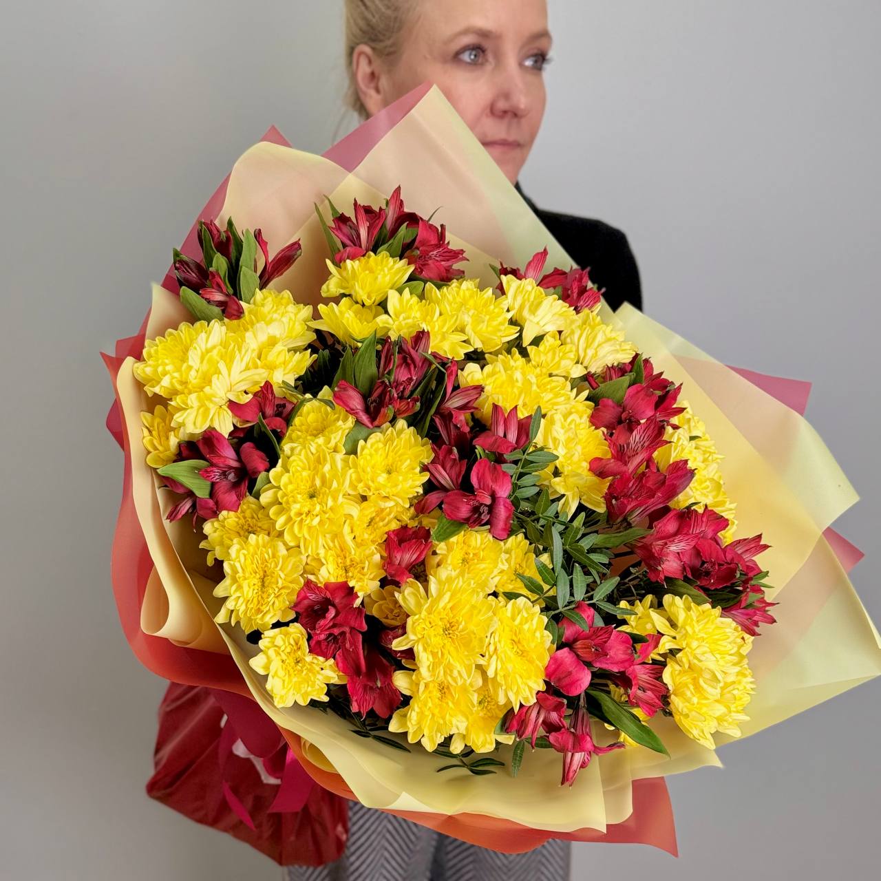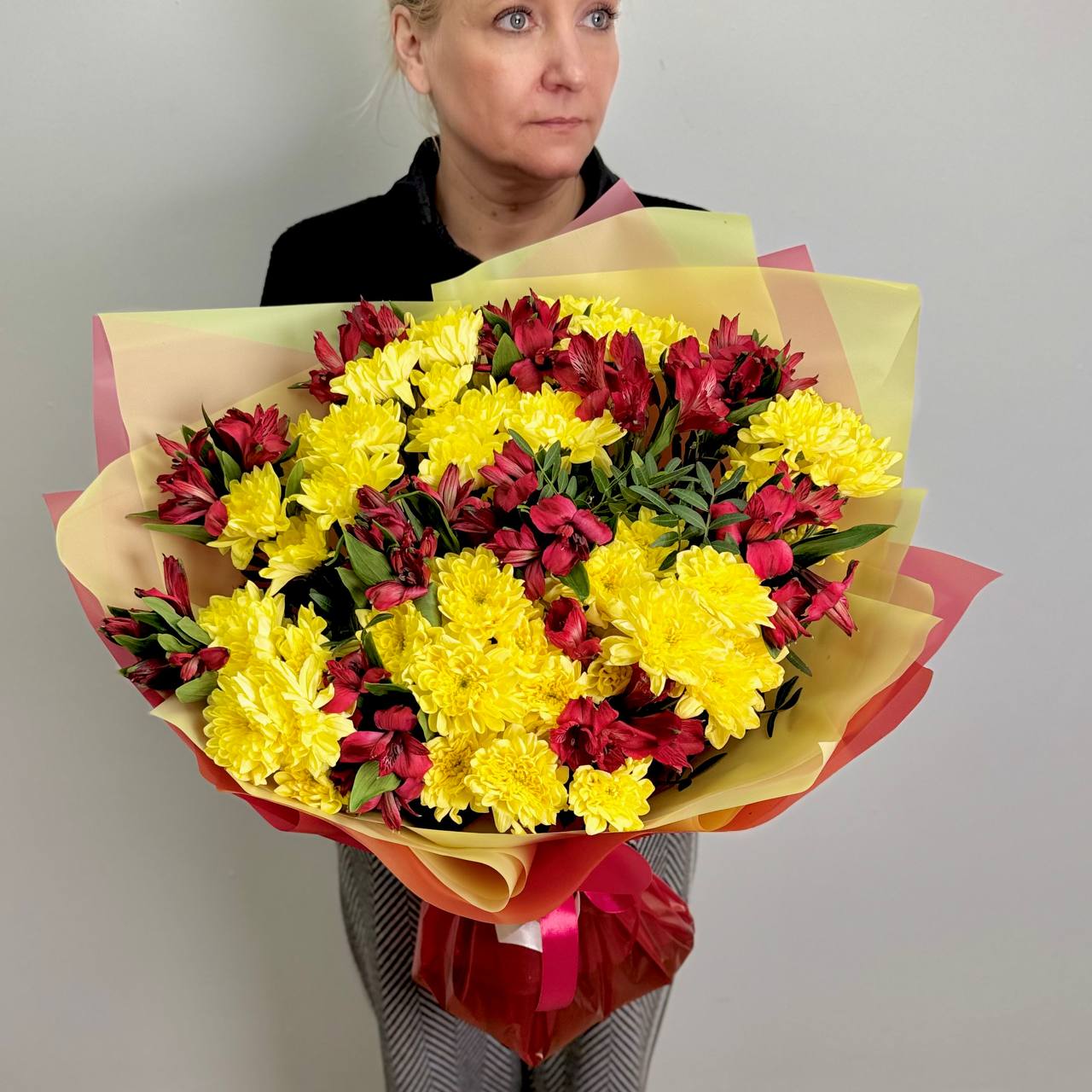 Альстромерия красная — 9 шт., хризантема кустовая желтая «Бакарди» — 10 шт., зелень, фирменная упаковка, атласная лента.