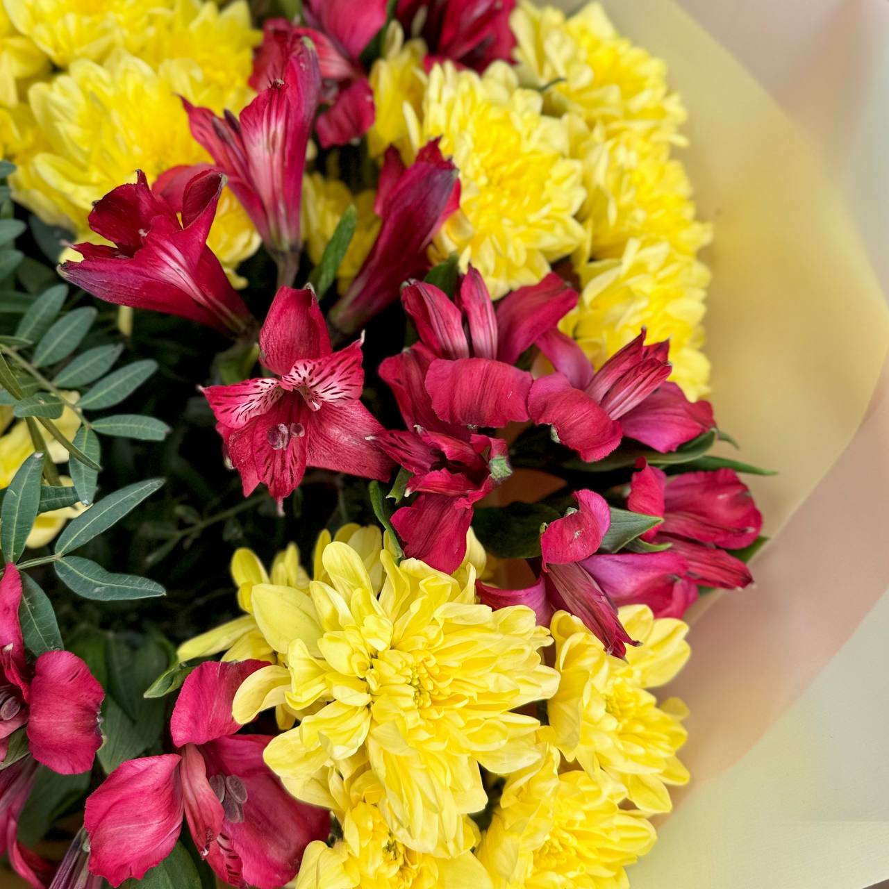 Зелень мягко обрамляет яркую палитру, создавая природный баланс и подчёркивая сочность основных цветов. Она придаёт композиции объём и свежесть, позволяя альстромериям и хризантемам раскрыться во всей красе.