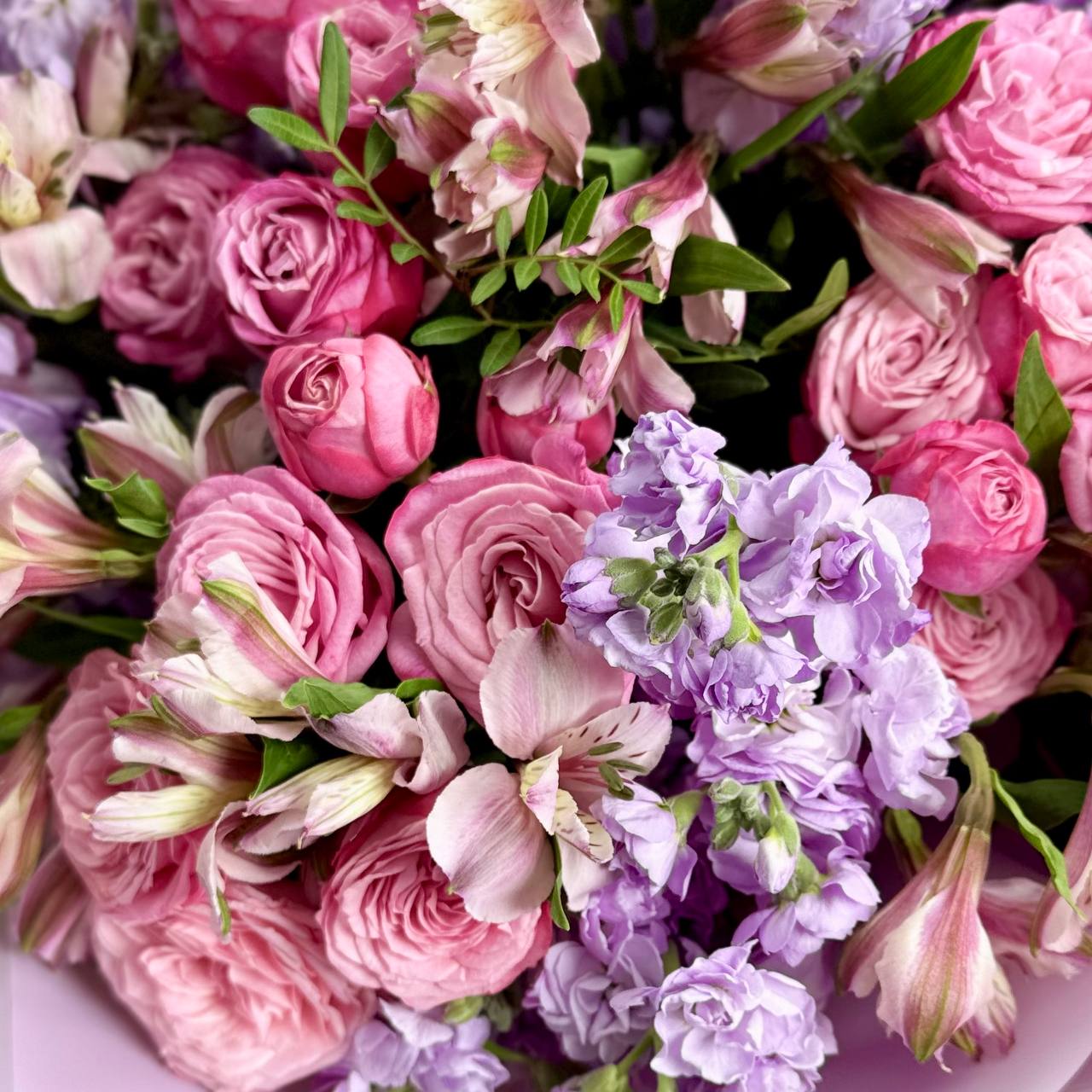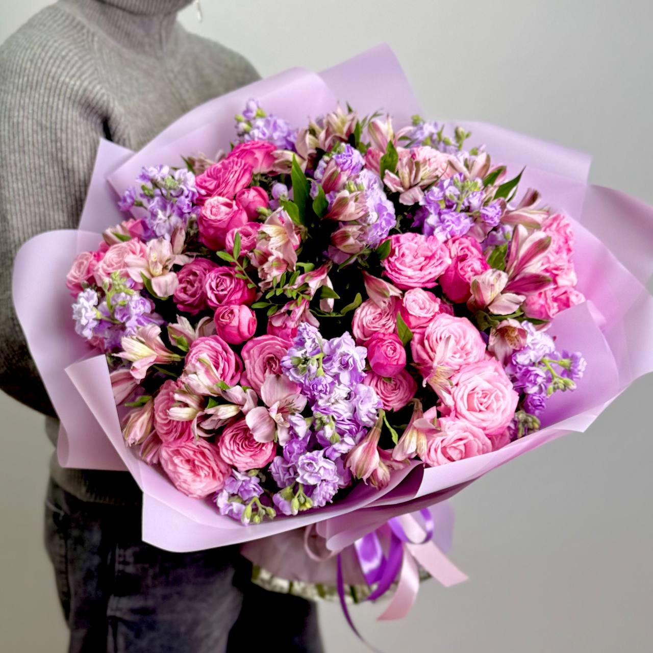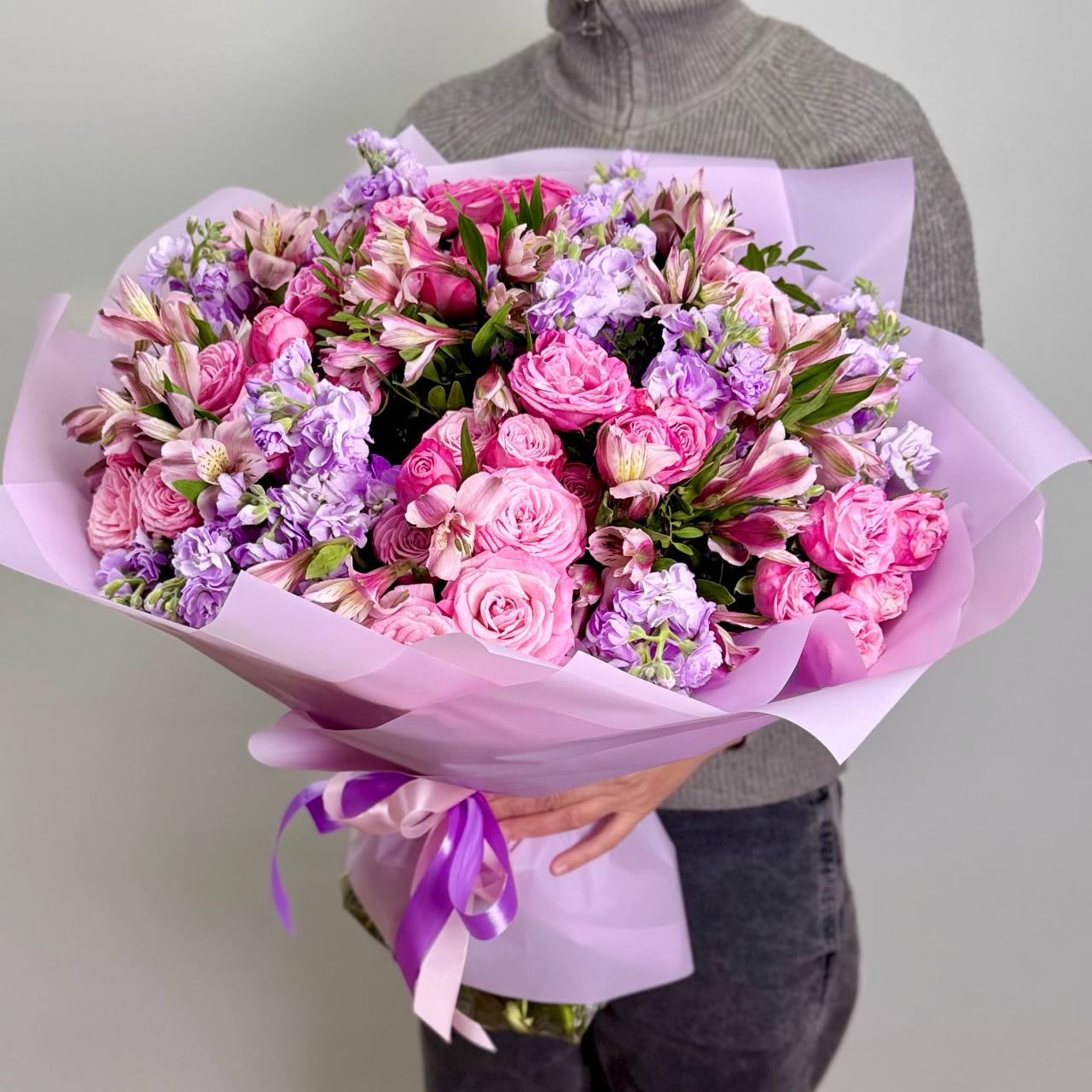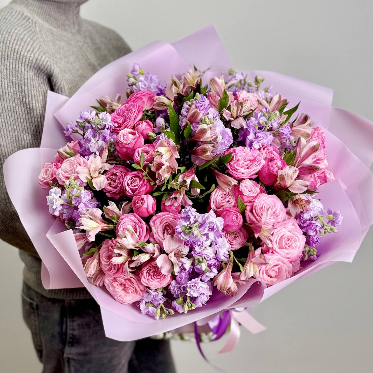 Альстромерия розовая — 10 шт., маттиола кустовая лавандовая — 10 шт., роза кустовая пионовидная «Леди Бомбастик» — 9 шт., зелень, фирменная упаковка, атласная лента.