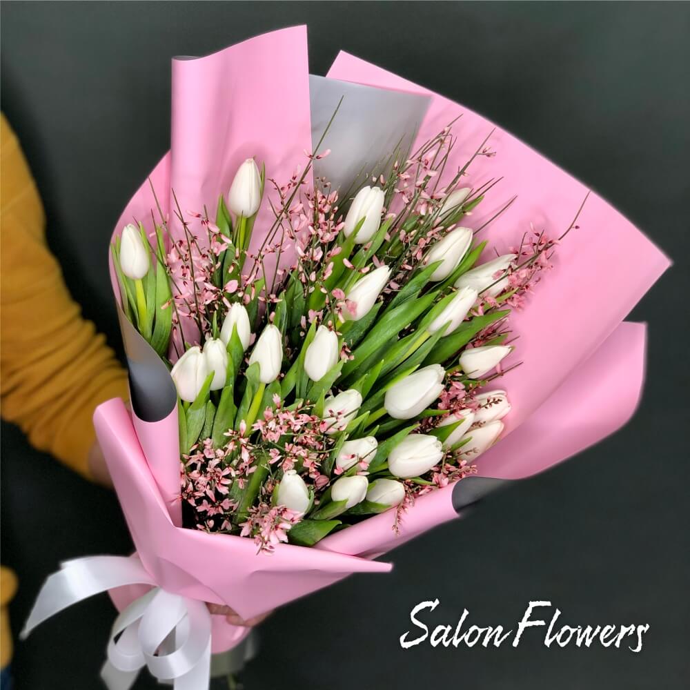 Тюльпан белый — 25 шт., гениста, фирменная упаковка, атласная лента.
