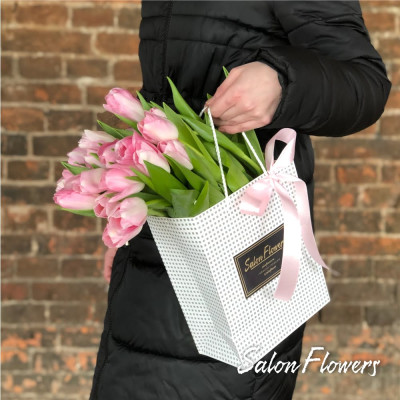 Тюльпан розовый — 25 шт., пакет, лента атласная.