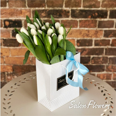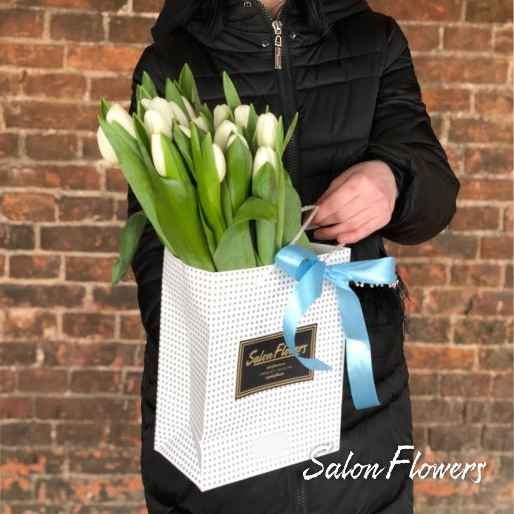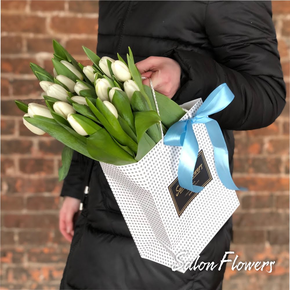 Тюльпаны белый — 25 шт., пакет, лента атласная.