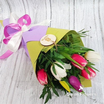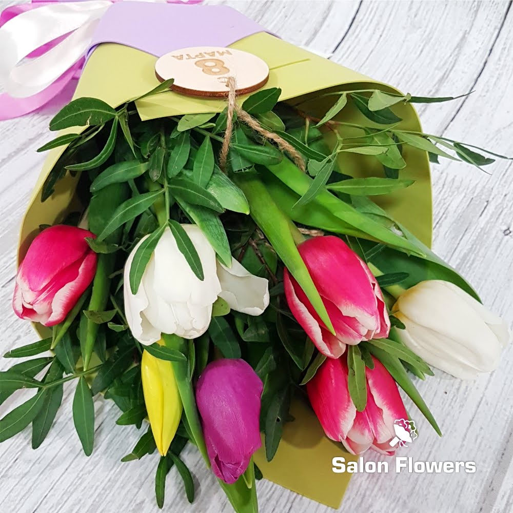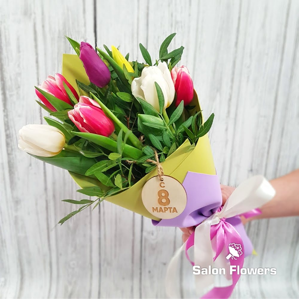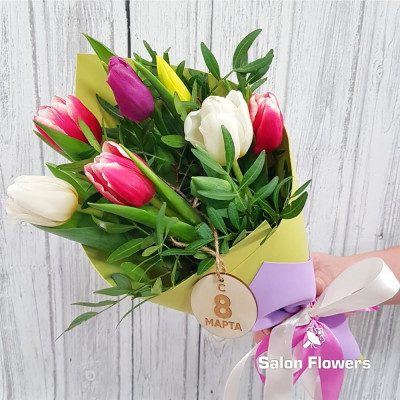 Тюльпан микс — 7 шт., шильдик «8 Марта», зелень, фирменная упаковка, атласная лента.