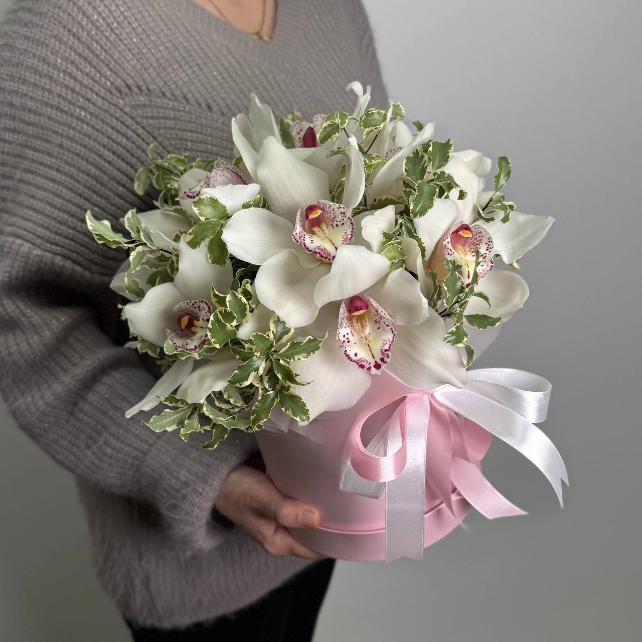 Цветы в шляпной коробке "Белоснежная орхидея"