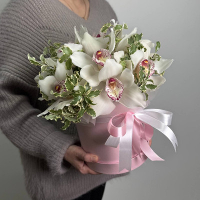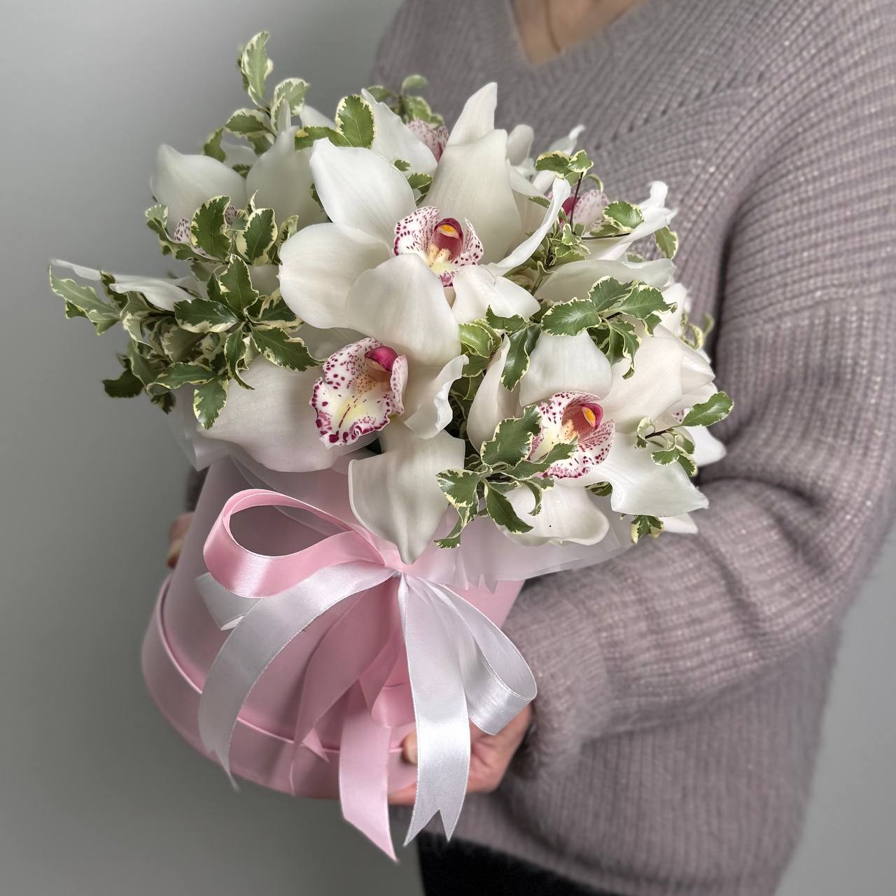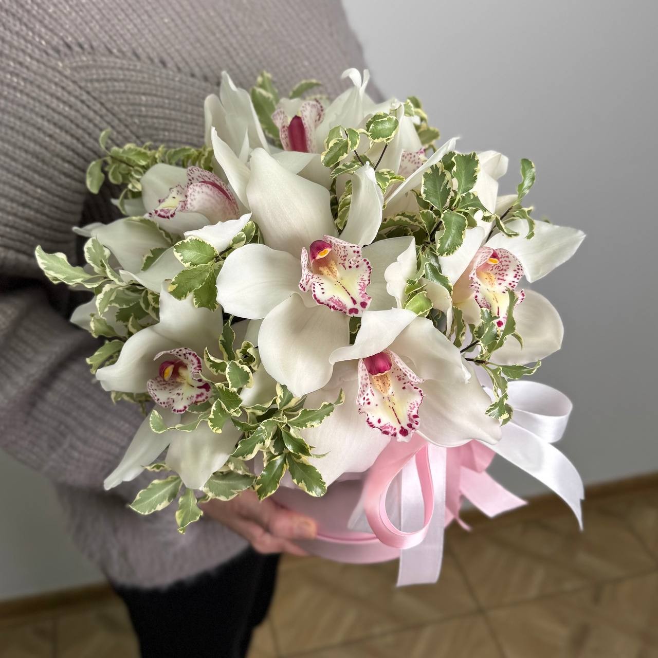 Орхидея «Цимбидиум» — 11 шт., питтоспорум, шляпная коробка 16х16 см., капсула-удлинитель — 11 шт., флористическая губка, атласная лента.