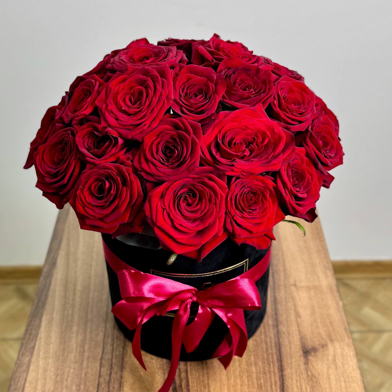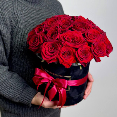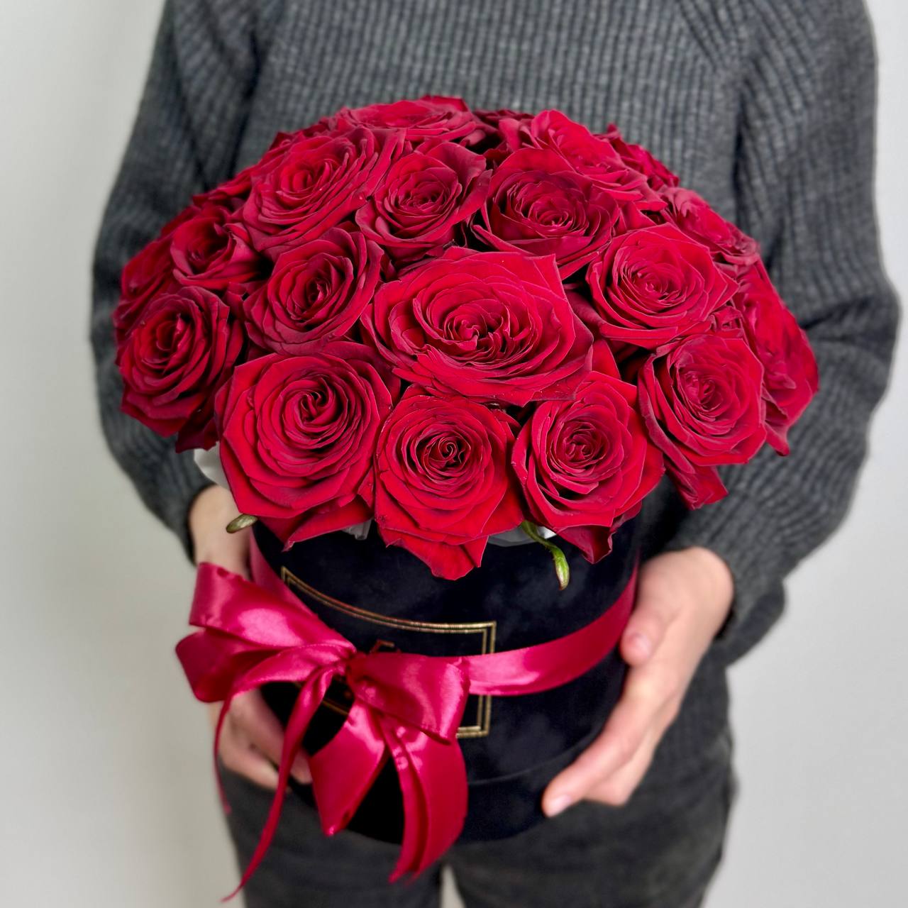 Роза «Россия Ред Наоми» — 29 шт., шляпная бархатная коробка 18х20 см., флористическая губка, атласная лента.