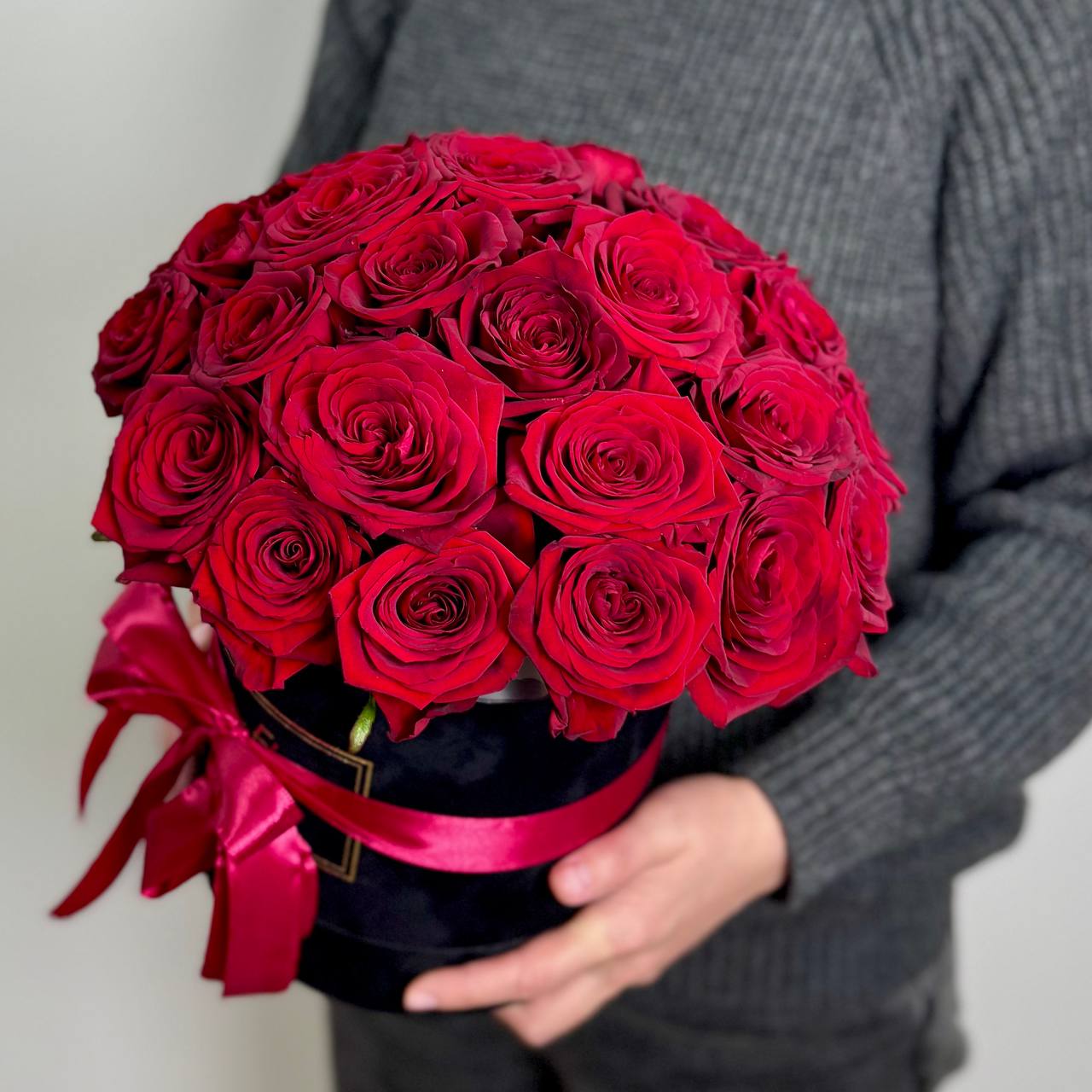Цветы в шляпной коробке "Ред Наоми"(29 роз)