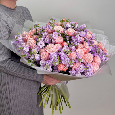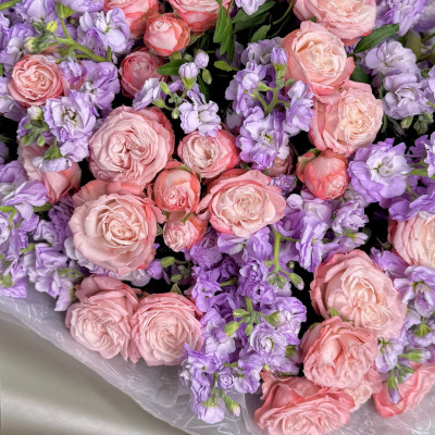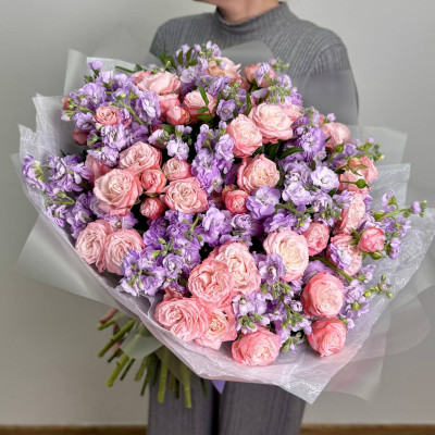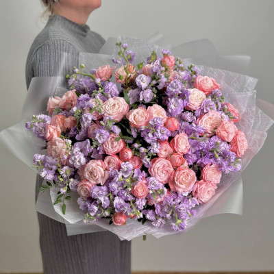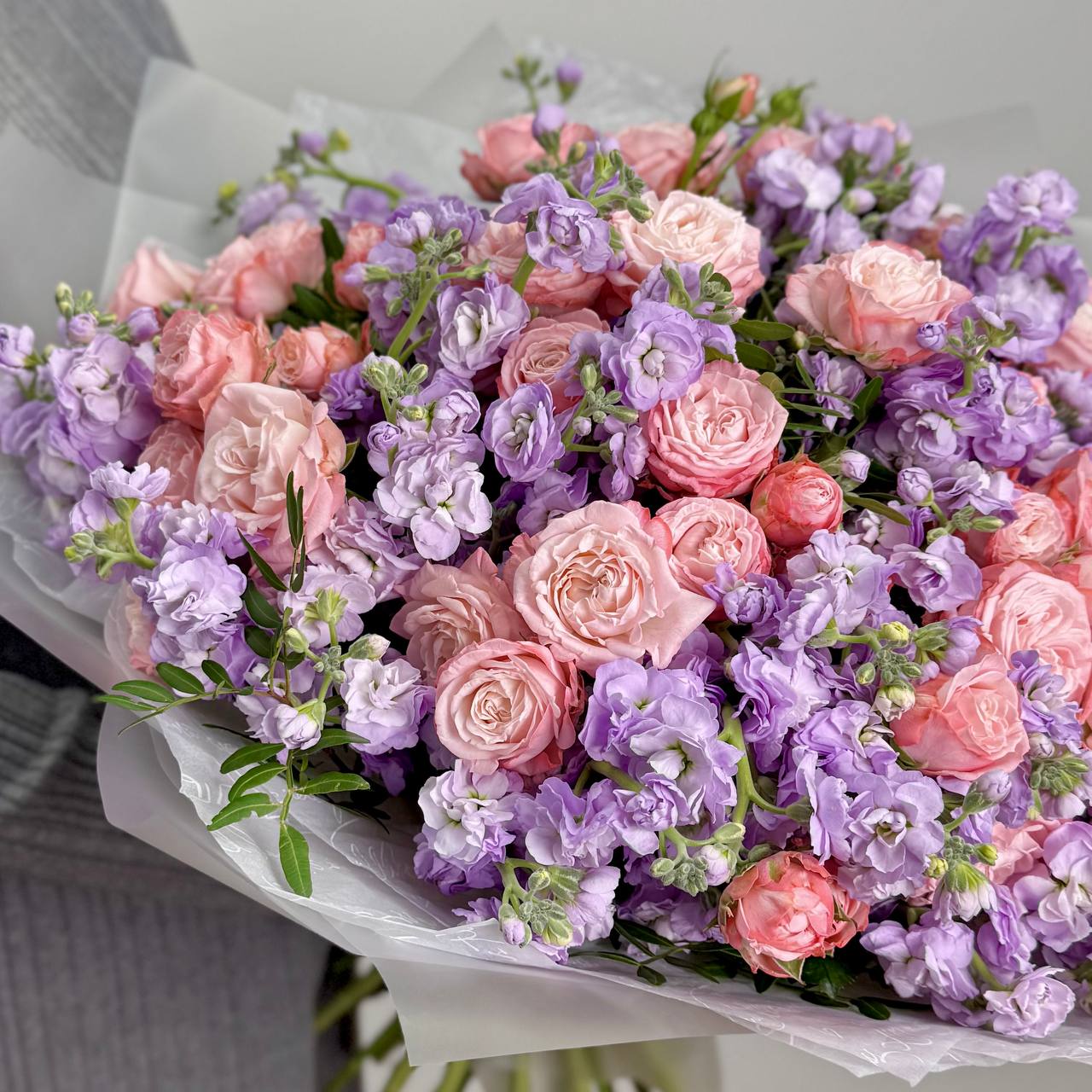 Букет «Сладкий аромат» — словно нежное признание, сотканное из шёпота цветов и лёгкого дуновения весеннего ветра. В нём переплелись пышность пионовидных роз и трепетная утончённость маттиолы, создавая мелодию, от которой сердце замирает в тихом восторге.