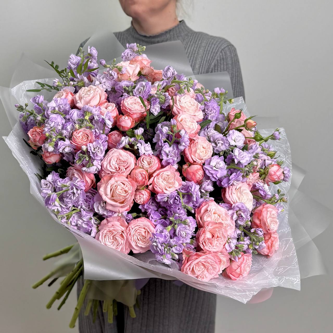 Маттиола кустовая фиолетовая — 20 шт., роза кустовая пионовидная «Мадам Бомбастик» — 15 шт., зелень, фирменная упаковка, атласная лента.