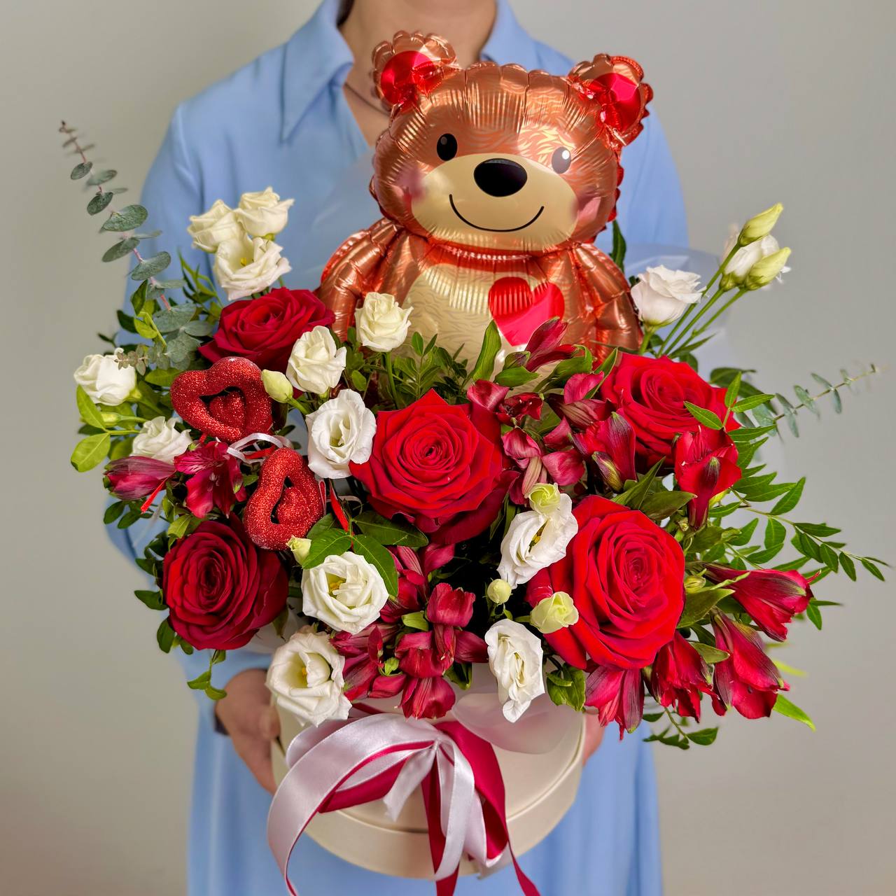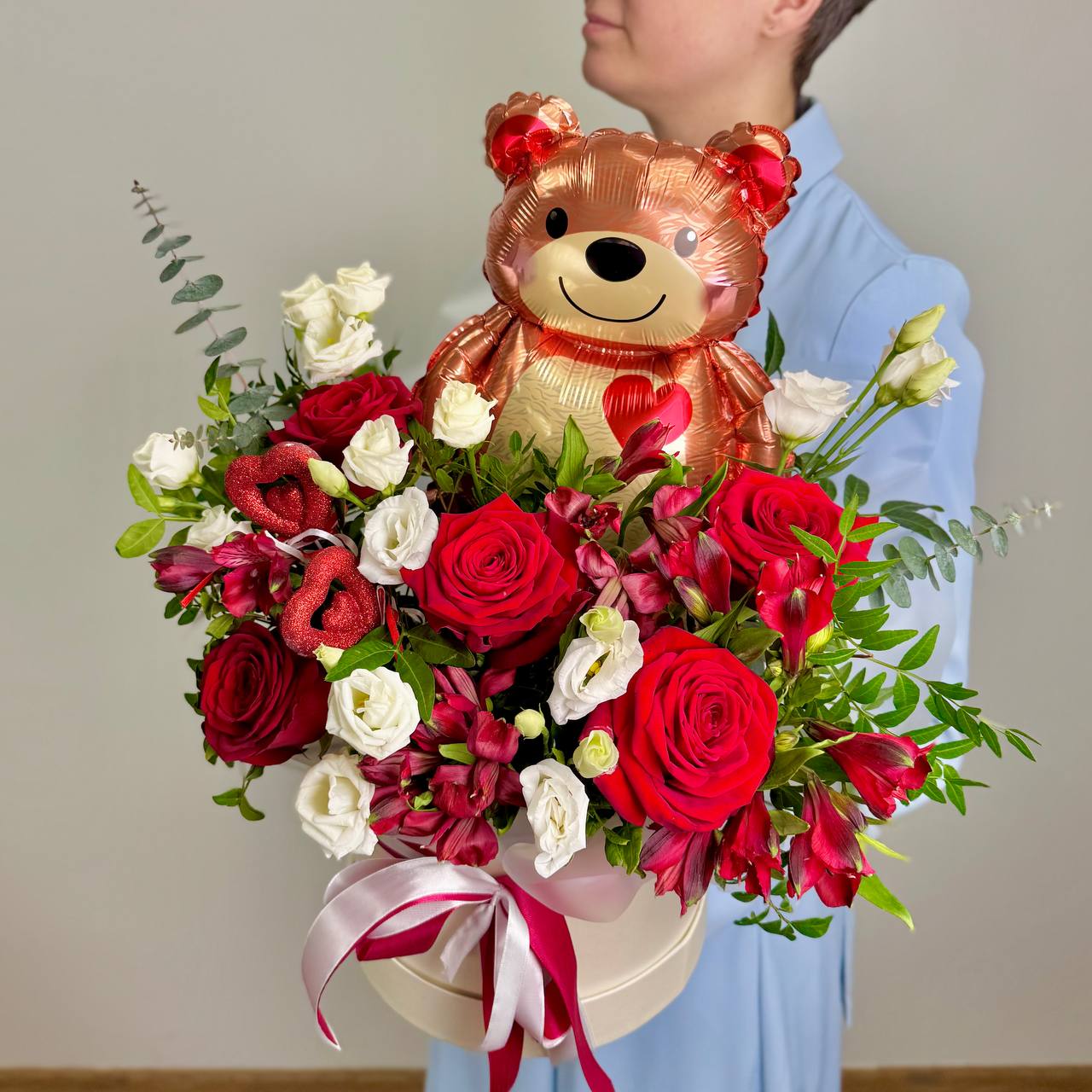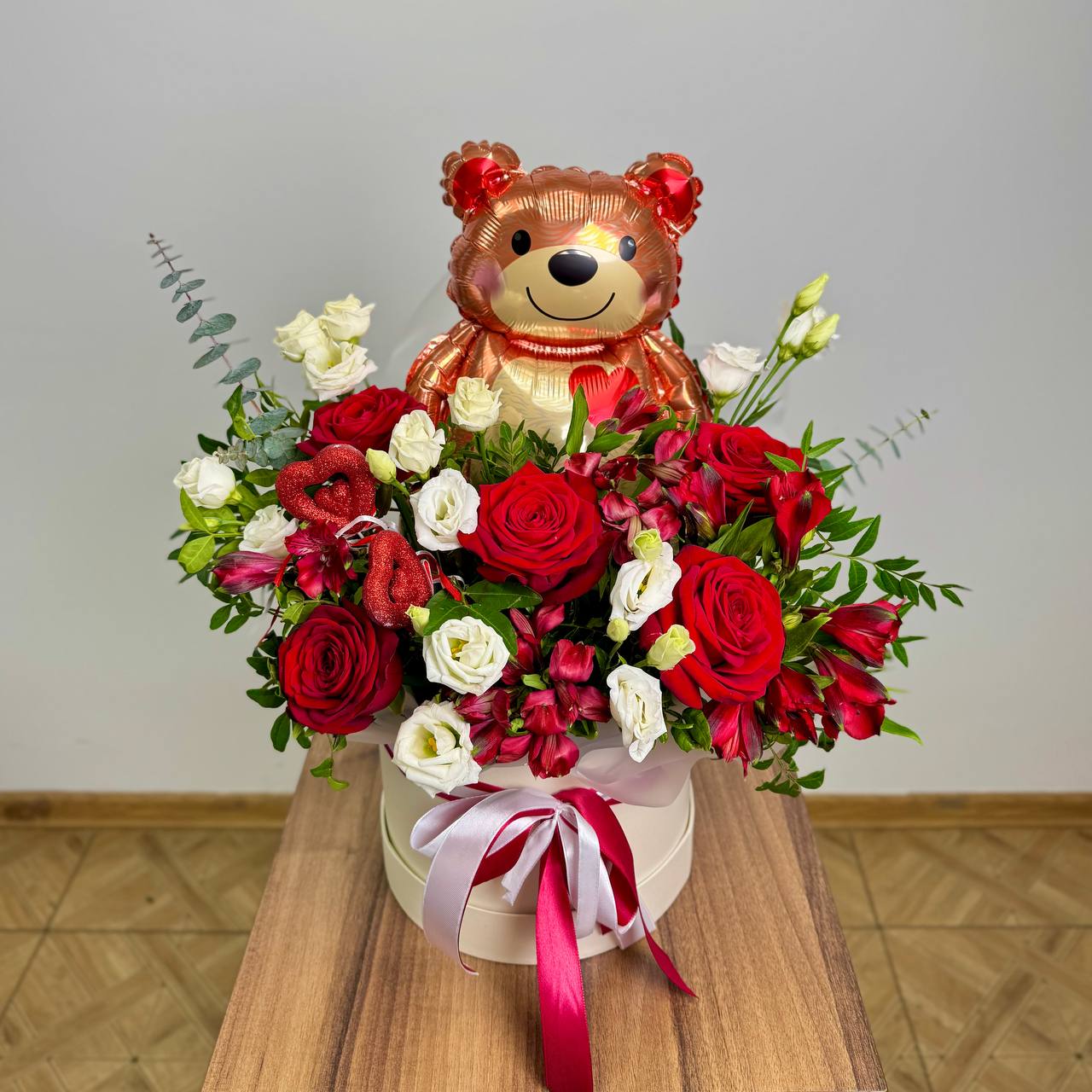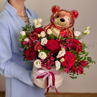 Роза «Ред Наоми» — 5 шт., альстромерия красная — 4 шт., эустома «Розита» — 2 шт., зелень, фольгированный шар «Мишка» — 1 шт., шляпная коробка, юбочка, флористическая губка, атласная лента.