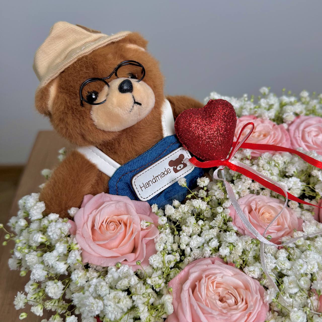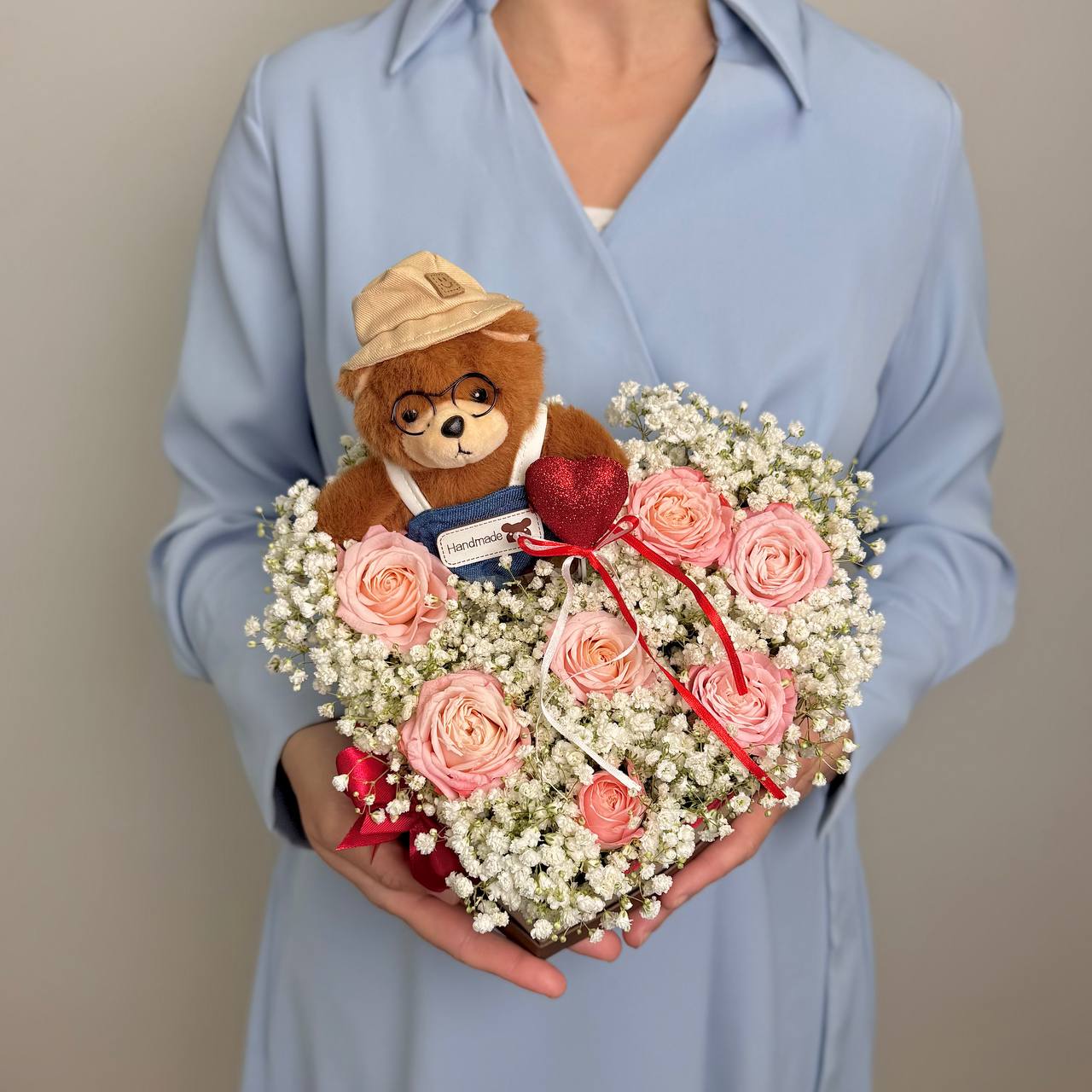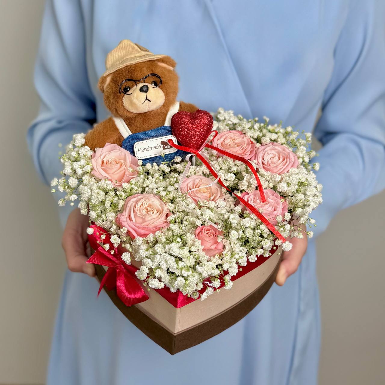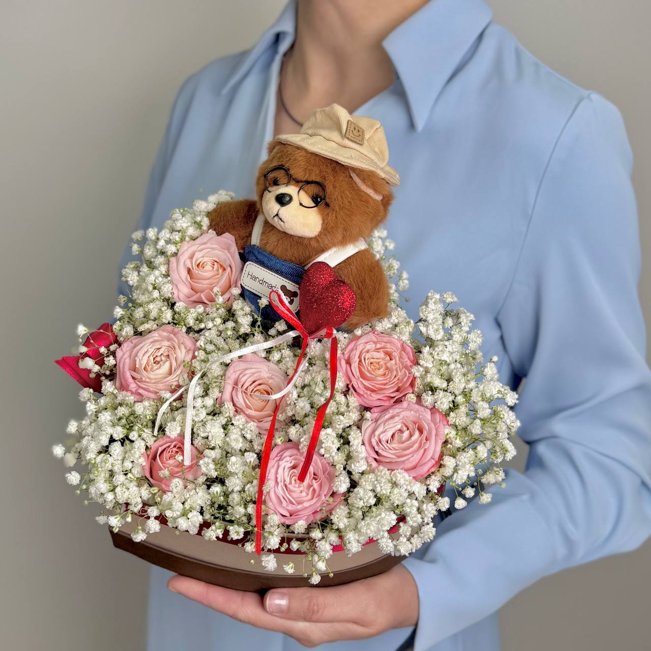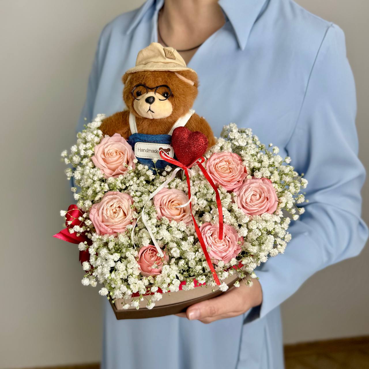 Гипсофила — 5 шт., роза кустовая «Мадам Бомбастик» — 1 шт., брелок «Мишка», декор «сердечко», шляпная коробка «Сердце», флористическая губка, атласная лента.