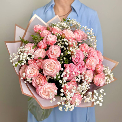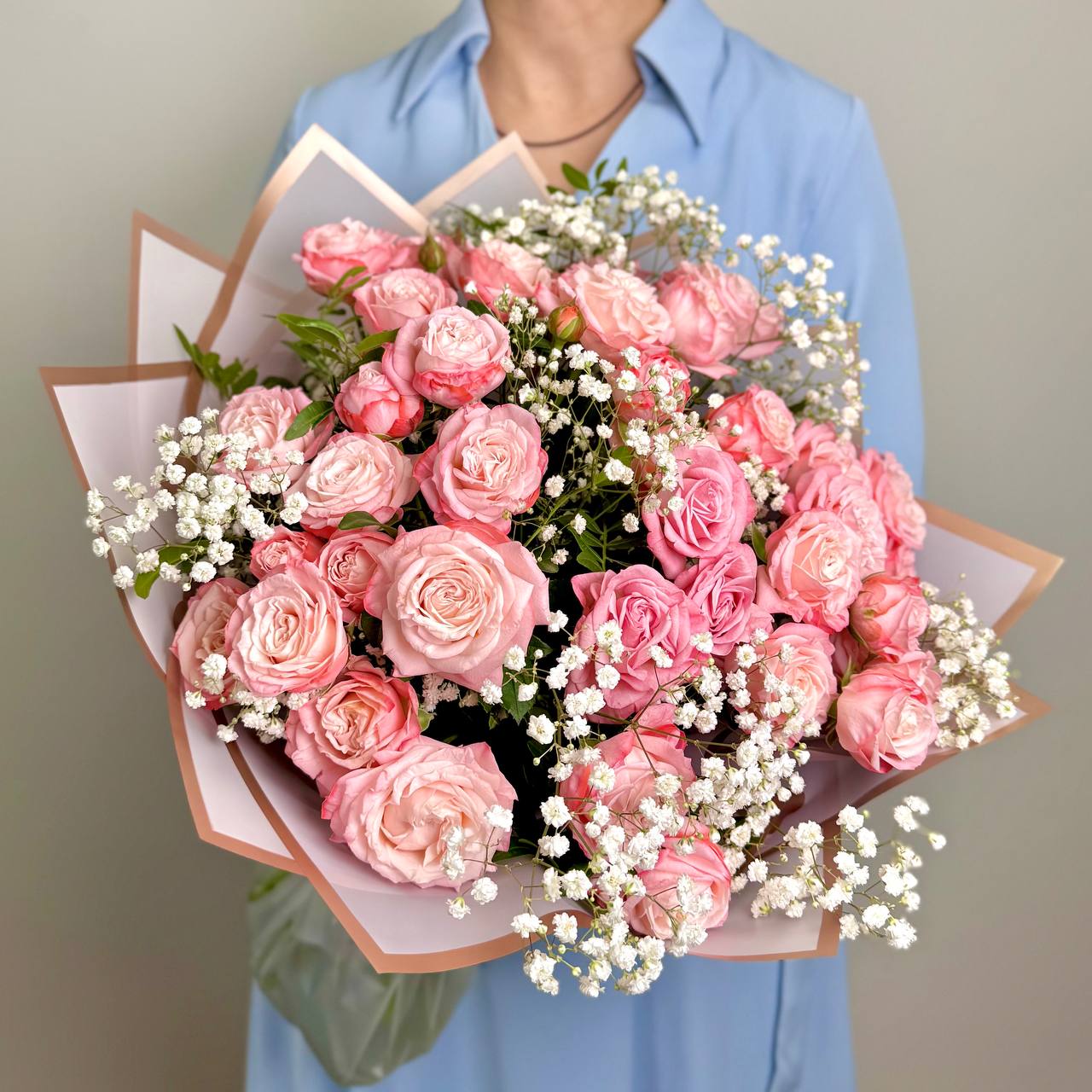 Роза пионовидная кустовая «Мадам Бомбастик» — 9 шт., гипсофила — 5 шт., фирменная упаковка, атласная лента.