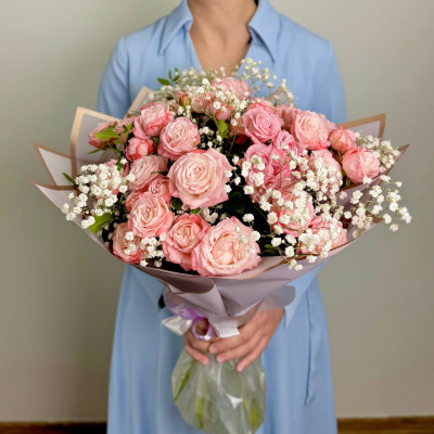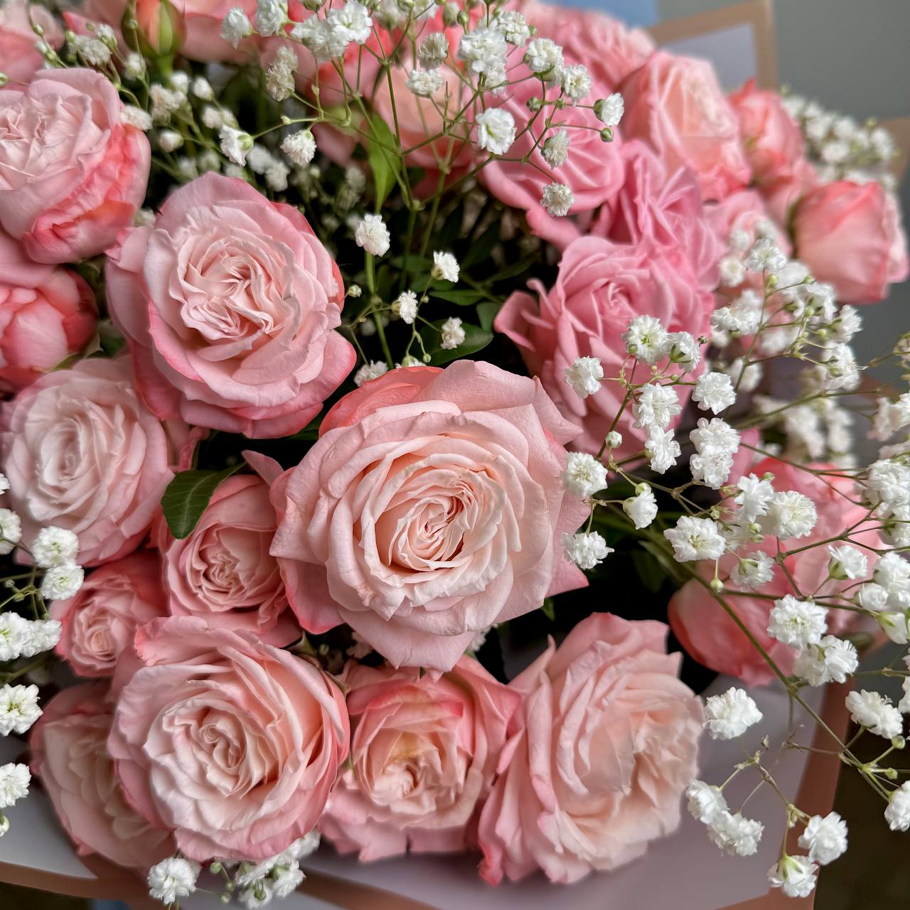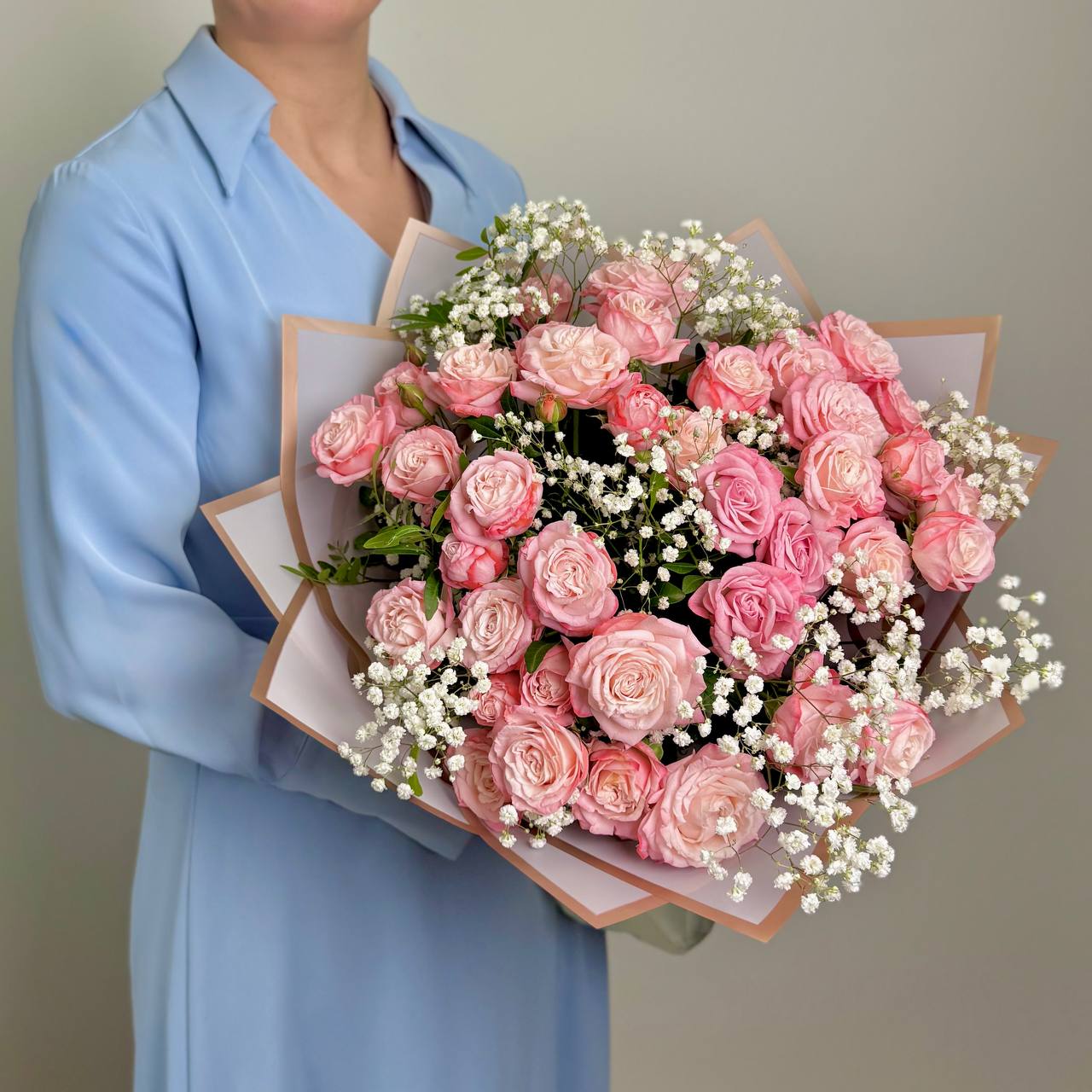 Букет «Вальс цветов» — это поэтичная симфония нежности и изящества, где каждая деталь словно движется в плавном танцевальном ритме. В центре композиции царственно расположились девять пионовидных кустовых роз «Мадам Бомбастик». Их пышные, многослойные бутоны напоминают миниатюрные бархатные вихри, переливаясь оттенками от нежно‑розового до глубокого кремового. Каждый цветок дышит утончённым ароматом, создавая атмосферу безмятежного весеннего утра.
