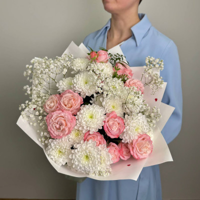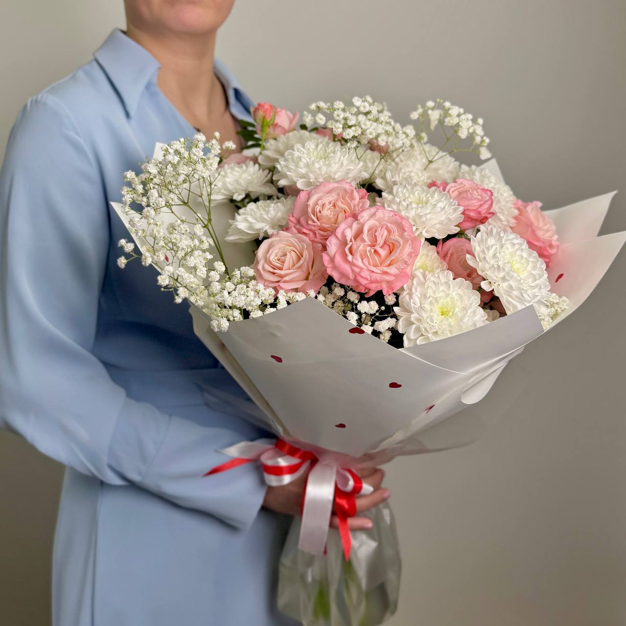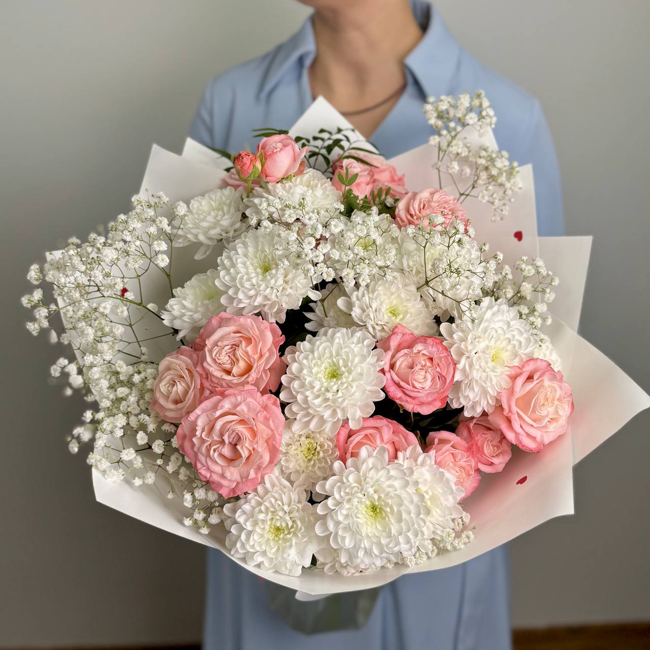 Роза кустовая пионовидная «Мадам Бомбастик» — 4 шт., хризантема кустовая — 3 шт., гипсофила — 3 шт., зелень, фирменная упаковка, атласная лента.