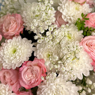 Мягким контрапунктом к роскошным розам звучат три кустовые хризантемы. Их объёмные соцветия, словно пушистые шарики света, привносят в композицию игривую лёгкость и теплоту. А три веточки воздушной гипсофилы, будто россыпь крошечных звёздочек, окутывают букет невесомой дымкой, добавляя ему романтичного очарования и объёма.