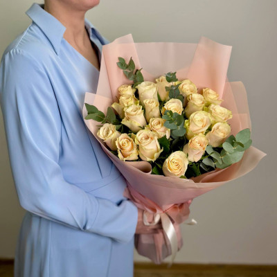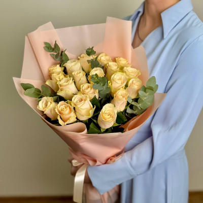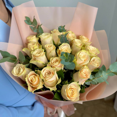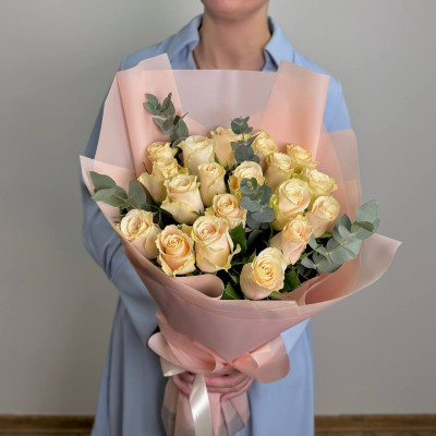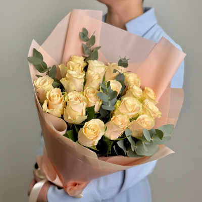 Роза «Кения Шармат» — 19 шт., эвкалипт, фирменная упаковка, атласная лента.