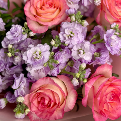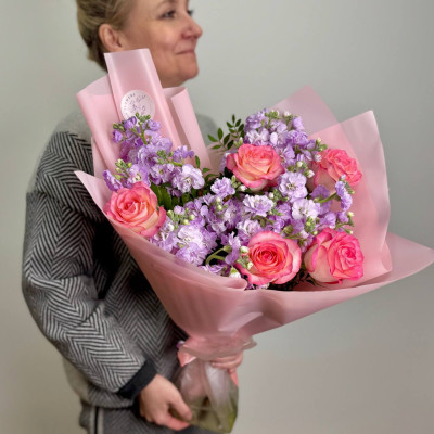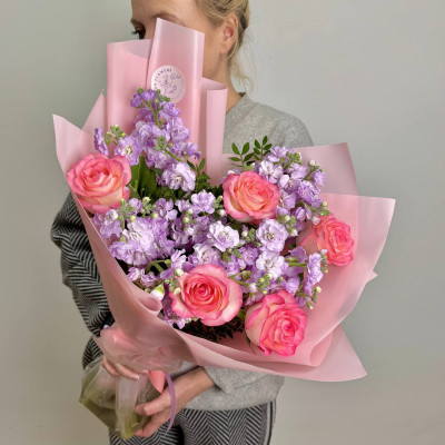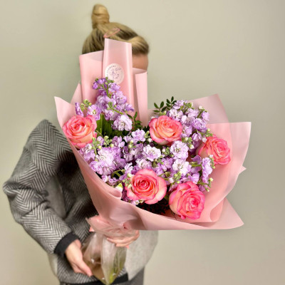 Букет «Джастин» — нежная симфония чувств, воплощённая в пяти розах «Россия Джумиля» и пяти веточках ароматной маттиолы. Благородные розы, полные достоинства и изящества, мягко перекликаются с воздушными соцветиями маттиолы, словно шёпотом рассказывающими о трепетных эмоциях. Фирменная упаковка деликатно обрамляет эту цветочную мелодию, а атласная лента, обвивающая стебли, добавляет композиции изысканности — будто подпись к искреннему посланию, написанному языком цветов.
