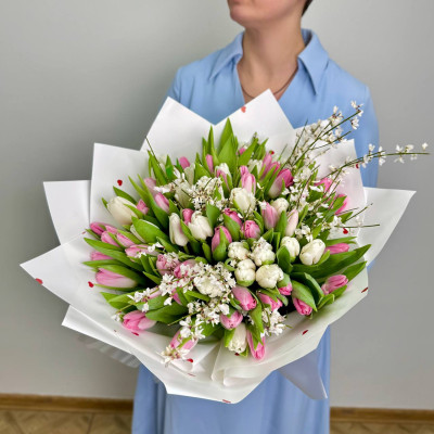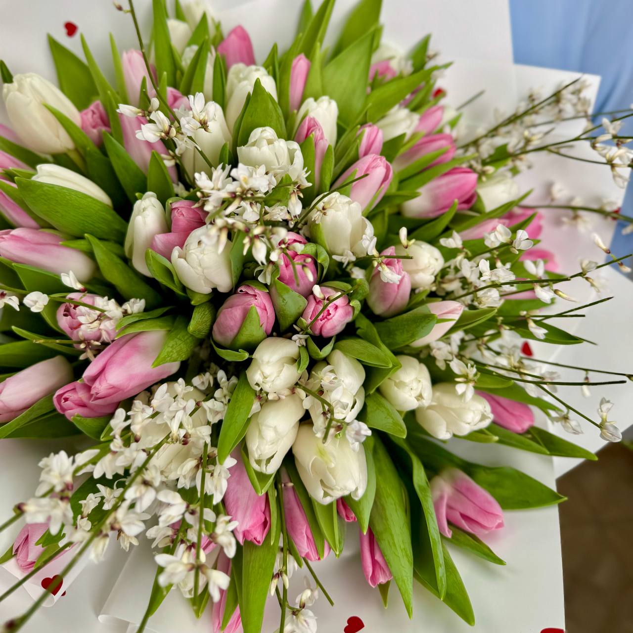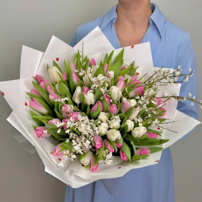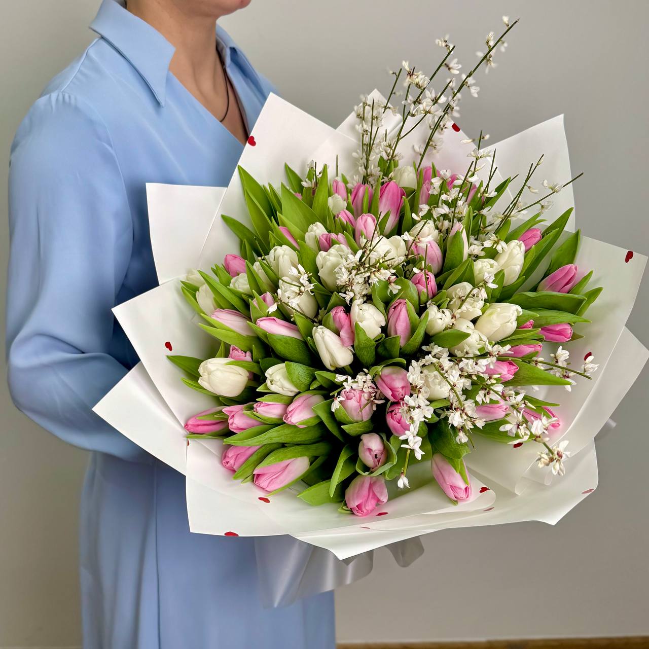 Тюльпан розовый — 50 шт., тюльпан белый — 25 шт., гениста белая — 5 шт., фирменная упаковка, атласная лента.