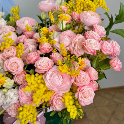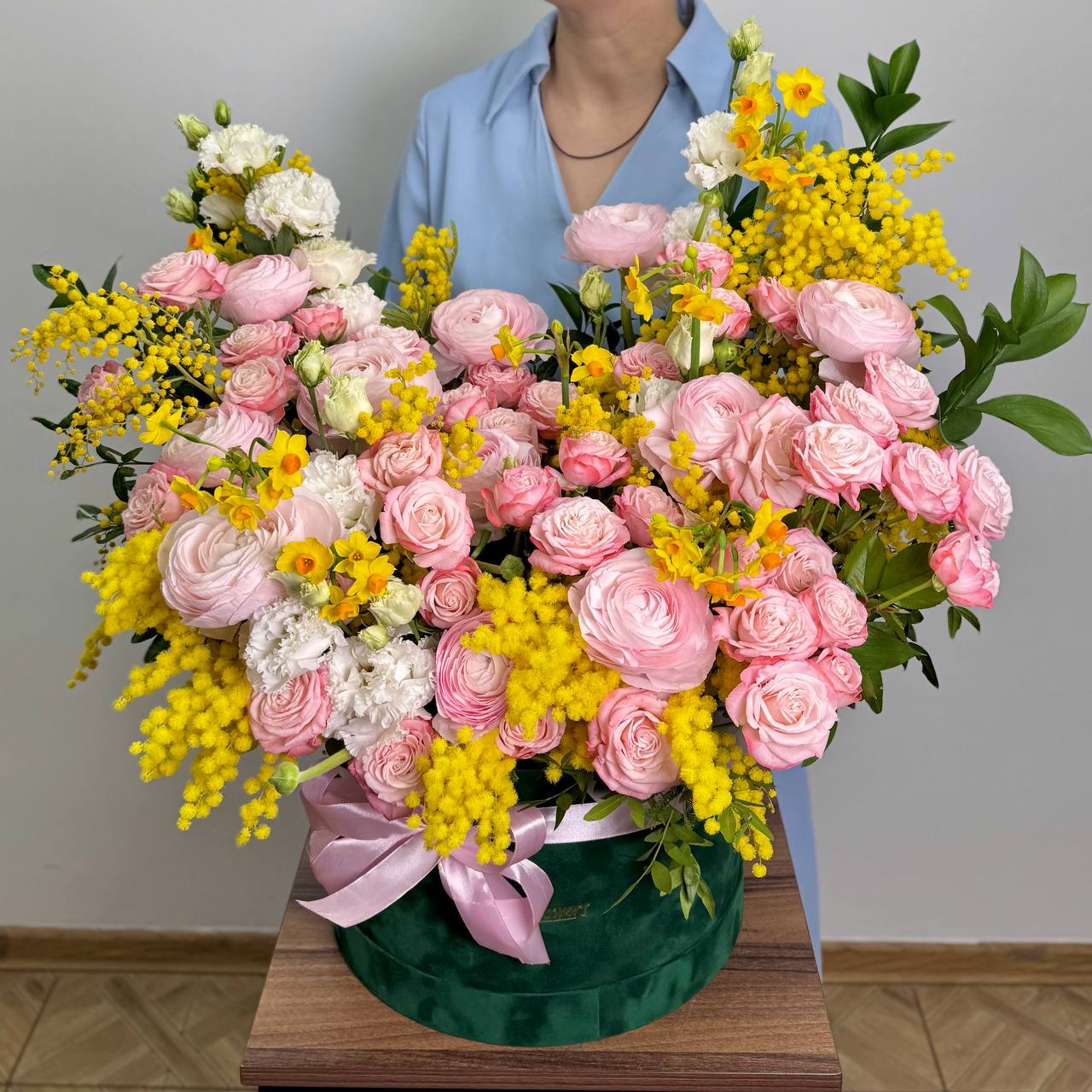 Мимоза Италия — 1 банч, нарцисс желтый — 10 шт., роза пионовидная кустовая «Мадам Бомбастик» — 10 шт., ранункулюс розовый — 10 шт., эустома «Алиса Вайт» — 5 шт., зелень, шляпная коробка бархатная 30х20 см, флористическая губка, атласная лента.