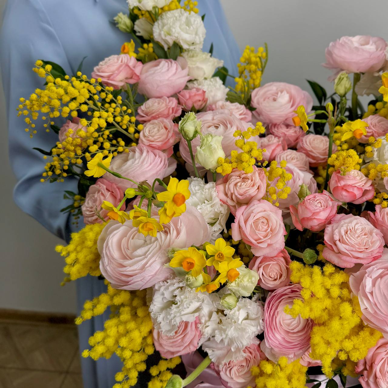 «Сад с мимозой» — словно кусочек солнечного итальянского утра, бережно уложенный в бархатную шляпную коробку. Золотистая мимоза, пушистая, как весеннее облако, наполняет композицию светом, а десять солнечных нарциссов добавляют ей радости и игривости. Десять пионовидных роз «Мадам Бомбастик» раскрывают свои пышные бутоны, даря ощущение роскоши и тепла, рядом с ними нежно мерцают розовые ранункулюсы, а белоснежная эустома «Алиса Вайт» придаёт ансамблю утончённость. Лёгкие штрихи зелени оживляют картину, атласная лента изящно обрамляет край коробки — будто последний штрих художника, создавшего эту цветочную идиллию.