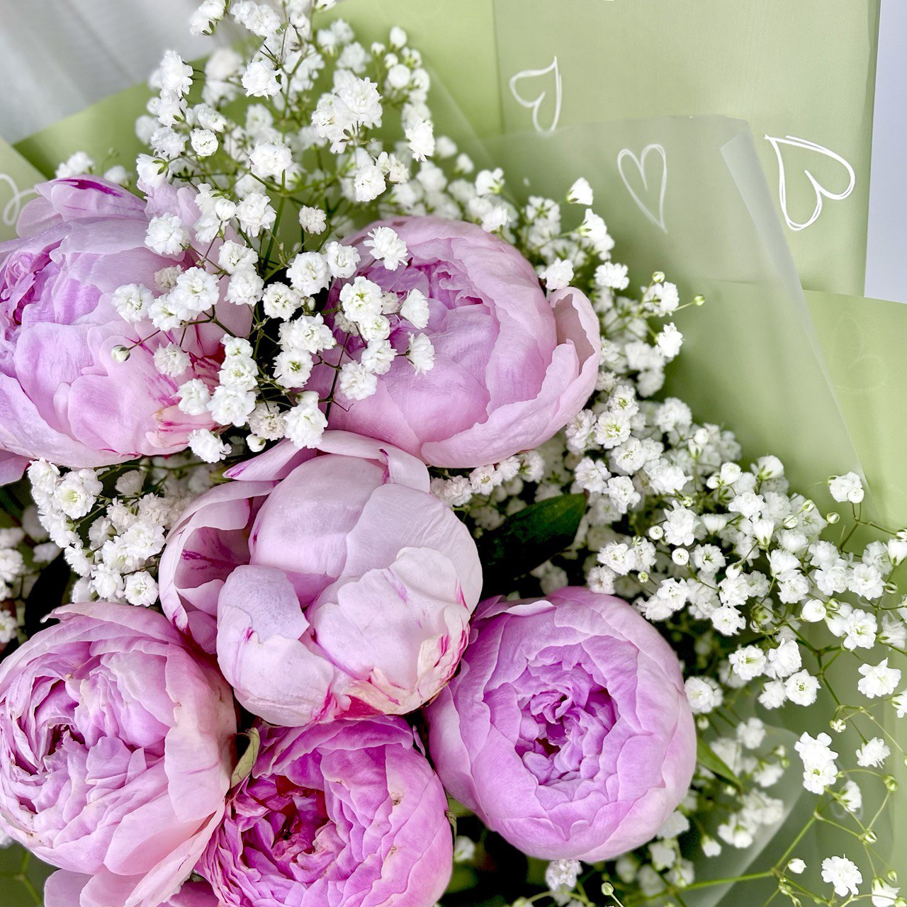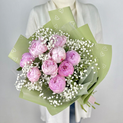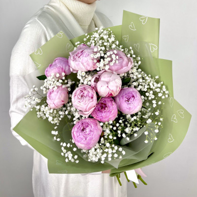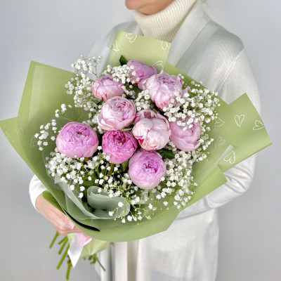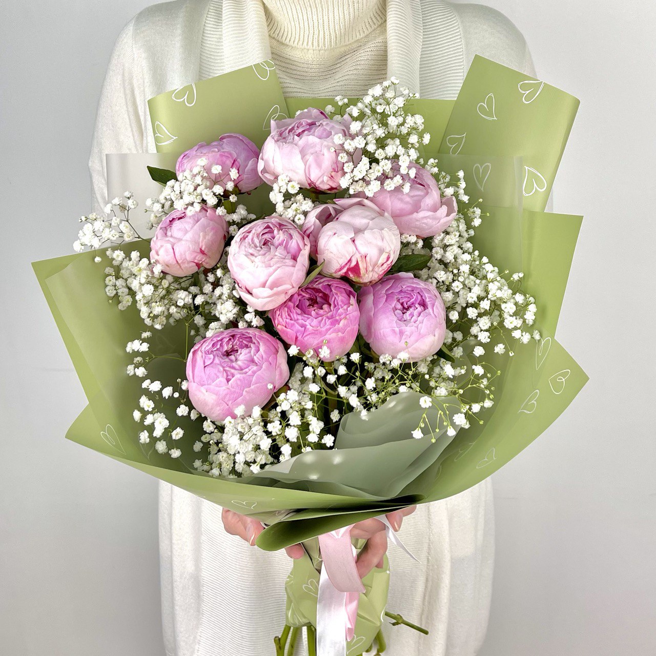Пионы «Сара Бернар» — 9 шт., гипсофила — 2 шт., фирменная упаковка, атласная лента.