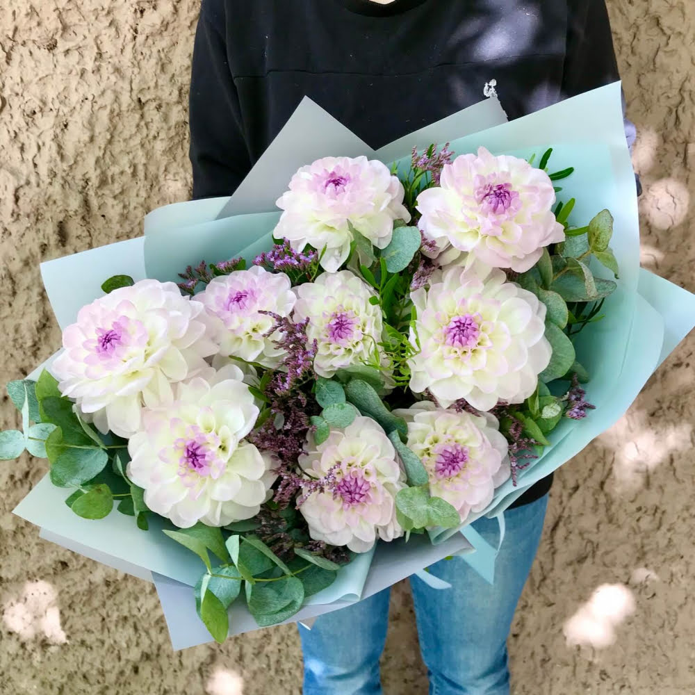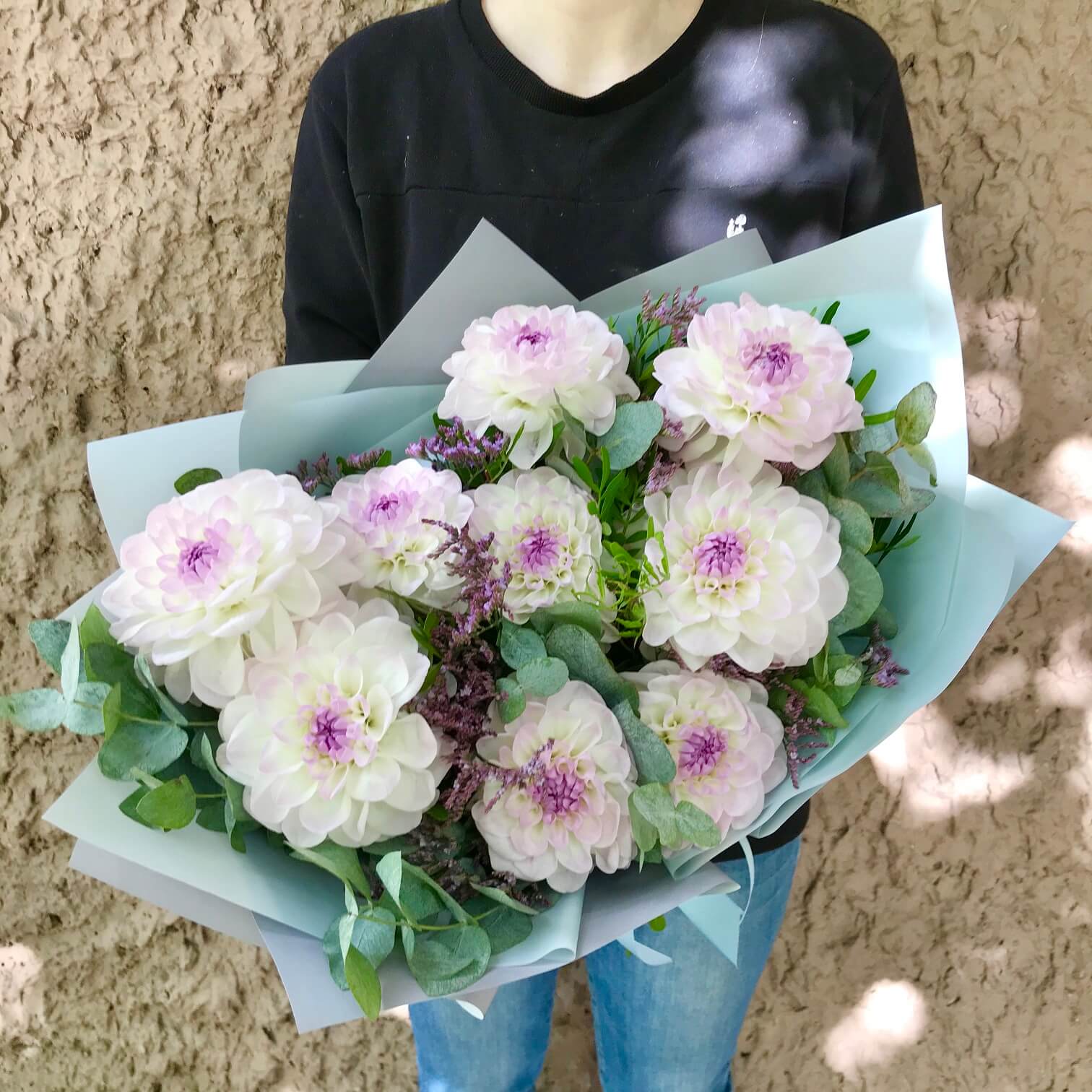 Георгина — 9 шт., лимониум, эвкалипт, фирменная упаковка, атласная лента.