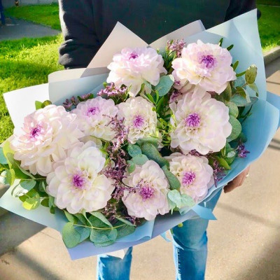 - Изысканный состав: В букете представлены не только роскошные георгины, но и изящный лимониум и ароматный эвкалипт. 🌿 Это сочетание цветов создает неповторимый визуальный эффект и наполняет воздух приятным ароматом.