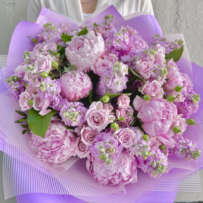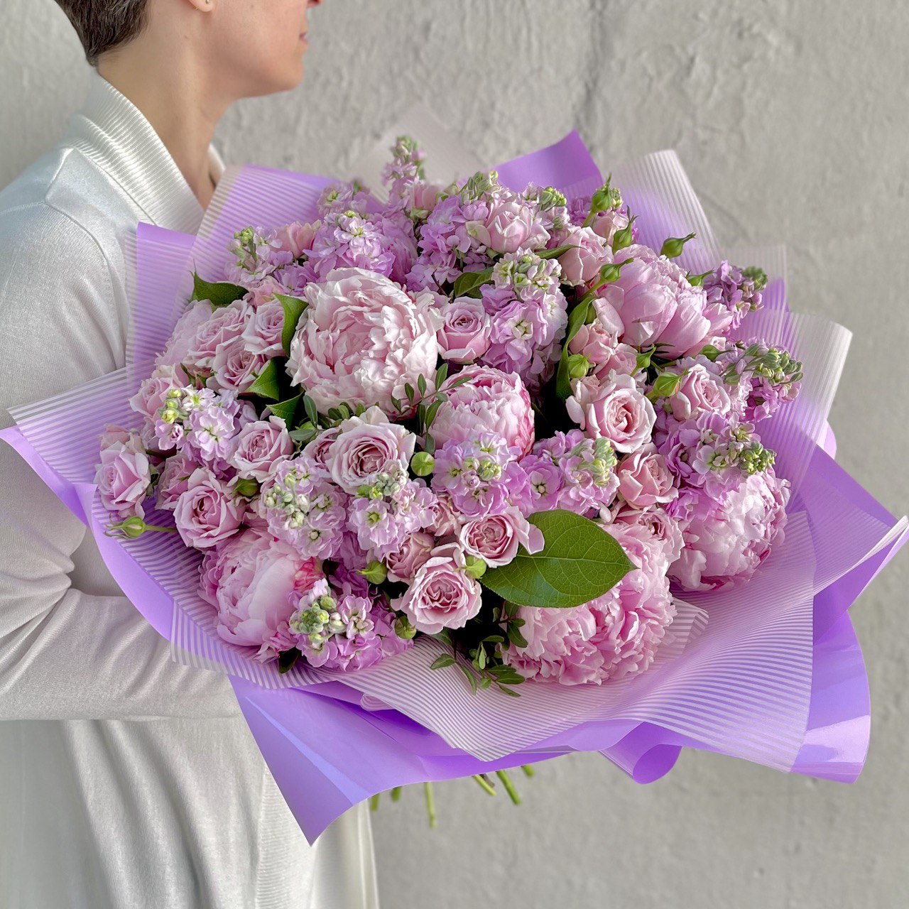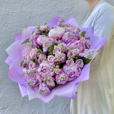В этой композиции гармонично слились элегантность и изящество: девять роскошных пионов сорта «Сара Бернар» соседствуют с десятью утончёнными кустовыми маттиолами, а десять очаровательных сиреневых кустовых роз добавляют ансамблю романтичный штрих.