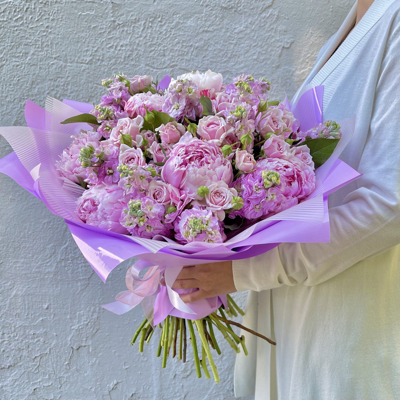 Пионы «Сара Бернар» — 9 шт., маттиола кустовая — 10 шт., роза кустовая сиреневая — 10 шт., зелень, фирменная упаковка, атласная лента.