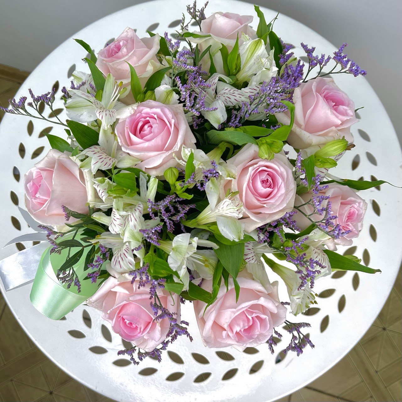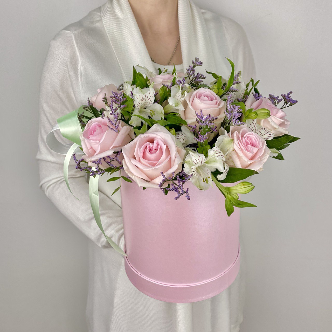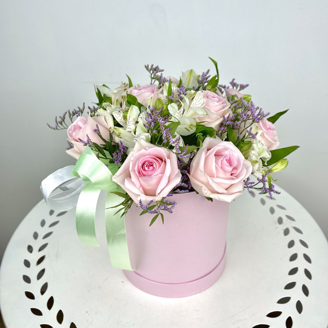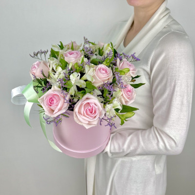 Роза «Россия Свит Ревиваль» — 10 шт., альстромерия белая — 5 шт., лимониум, писташ, шляпная коробка 18х20 см., флористическая губка, атласная лента.