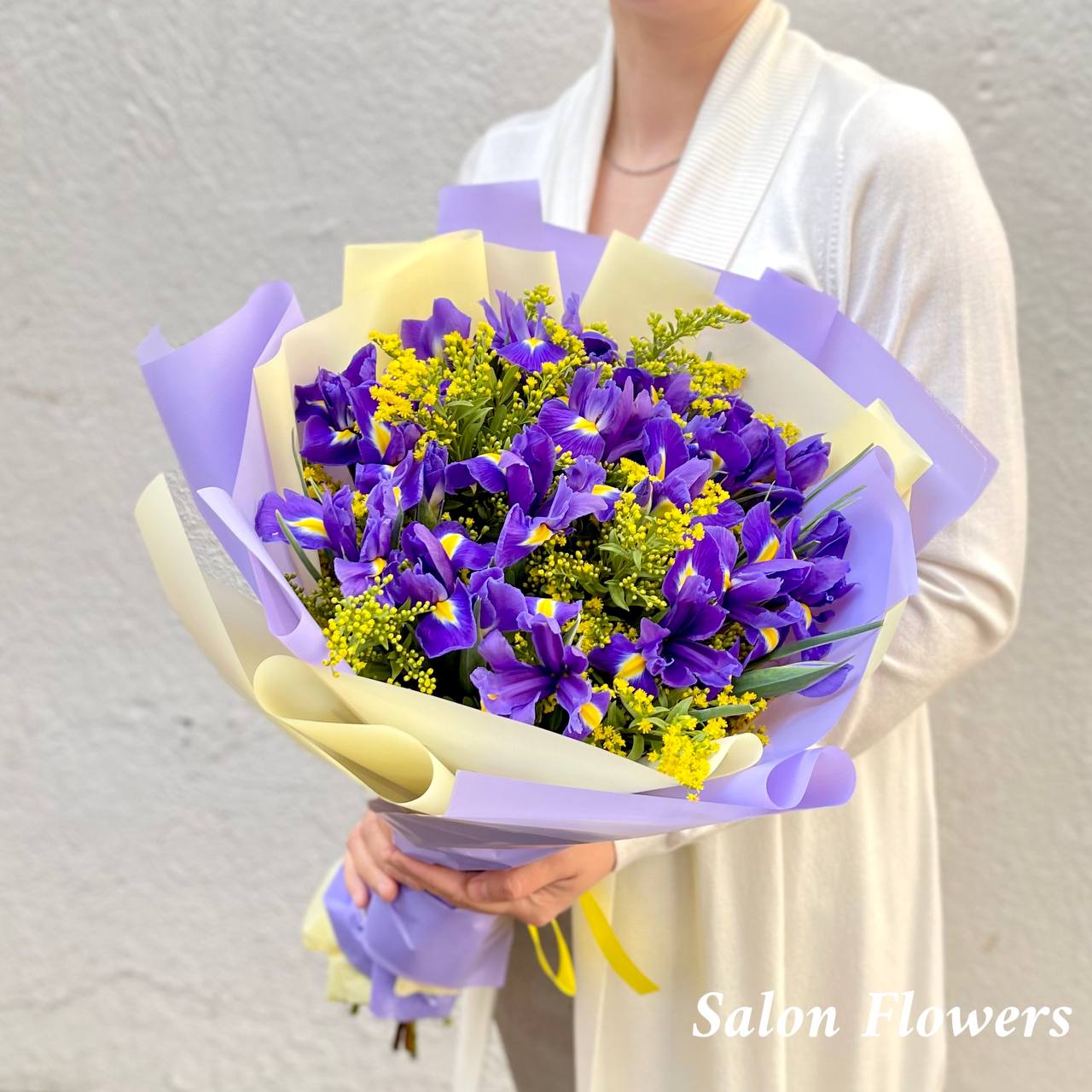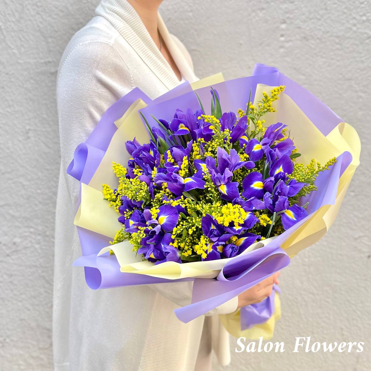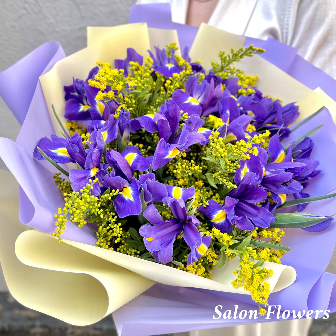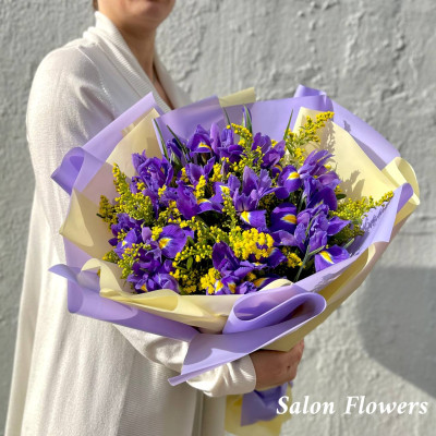 Ирис — 25 шт., солидаго — 5 шт., фирменная упаковка, атласная лента.