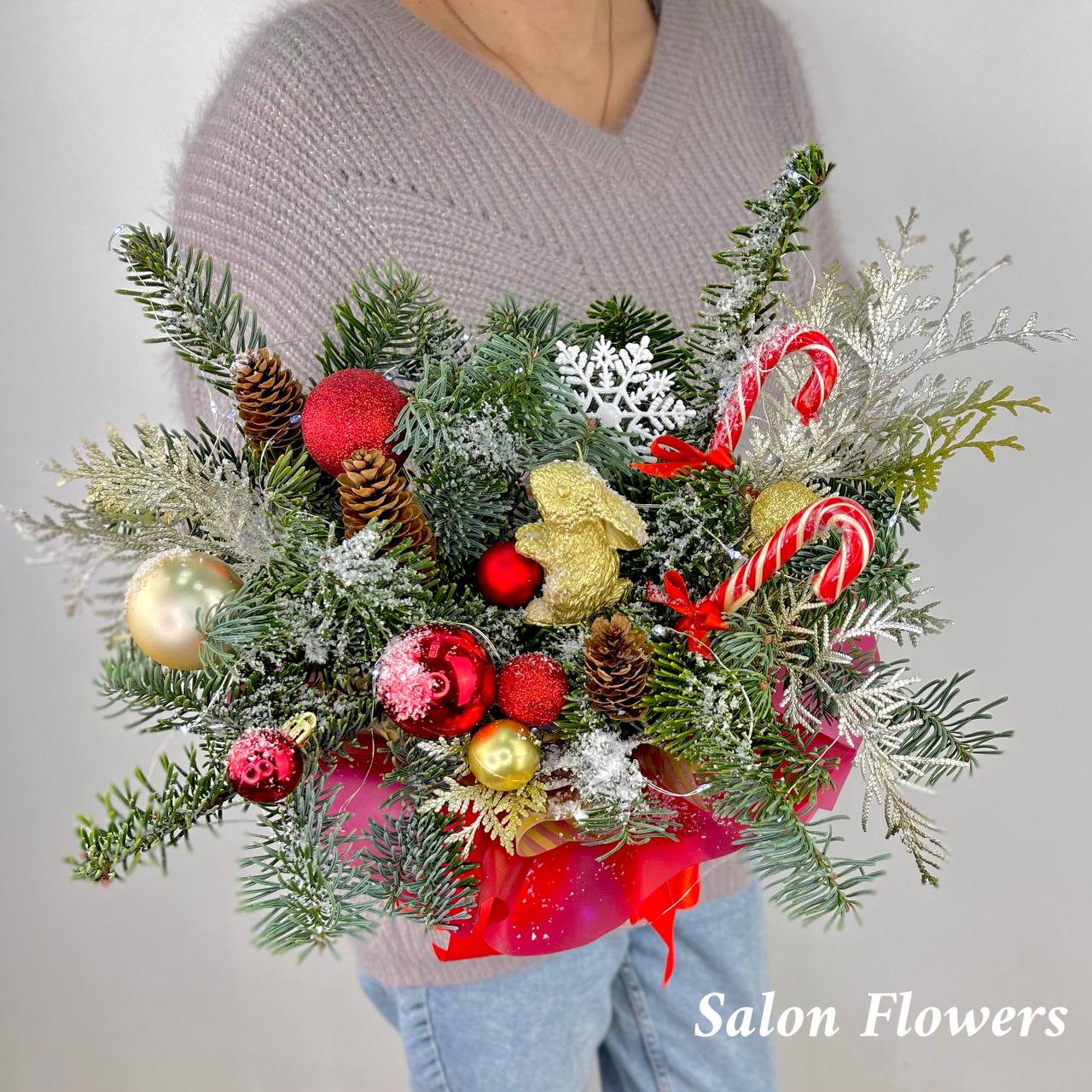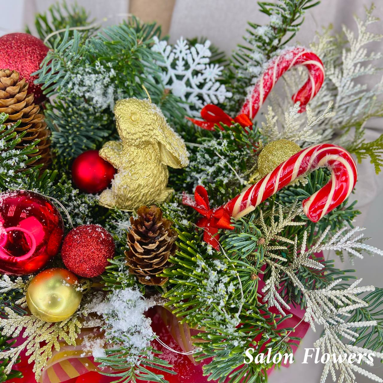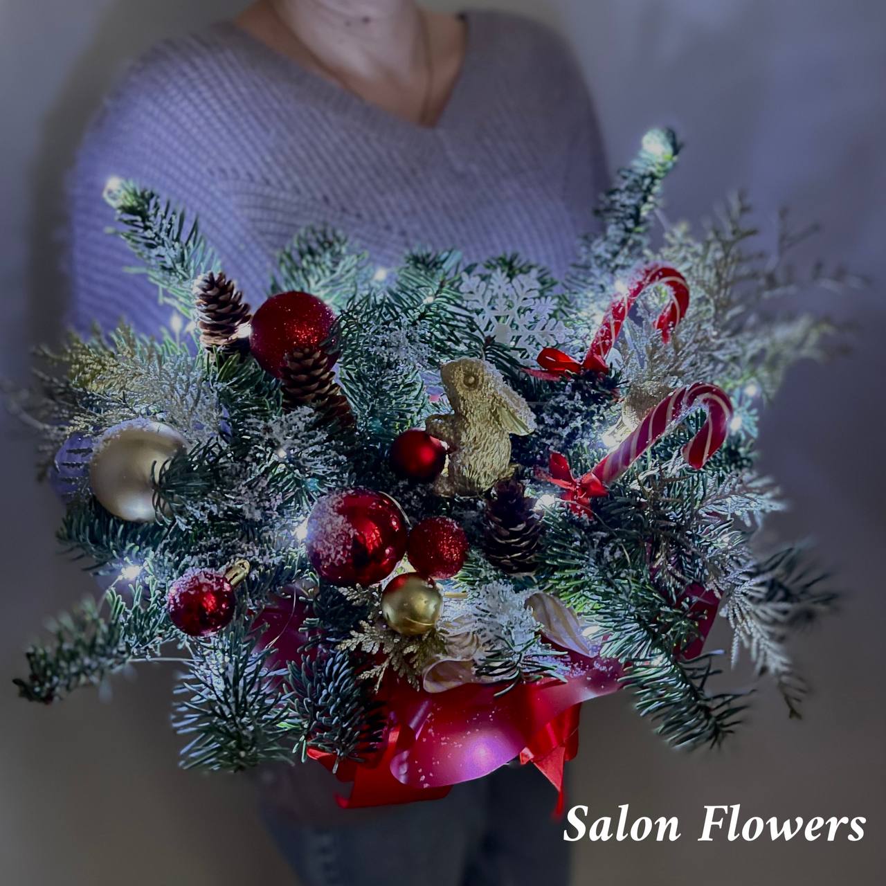 Нобилис — 1 шт., туя — 3 шт., свеча «Зайка» — 1 шт., карамельная трость (съедобная) — 2 шт., гирлянда с огоньками — 1 шт., новогодние игрушки — 8 шт., шишки — 3 шт., снежинка — 1 шт., флористическая губка, фирменная упаковка, атласная лента.