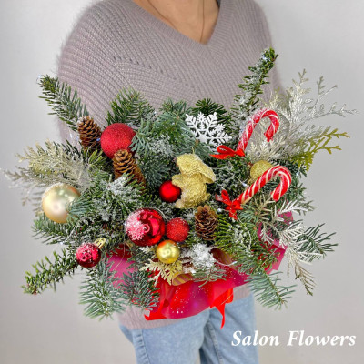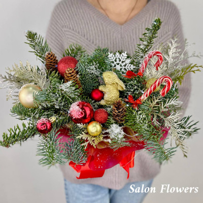 Перед вами — миниатюрная вселенная новогоднего чуда, где каждая деталь словно излучает тёплый свет предвкушения праздника. Композиция «Золотой символ» объединяет природную свежесть, уют...