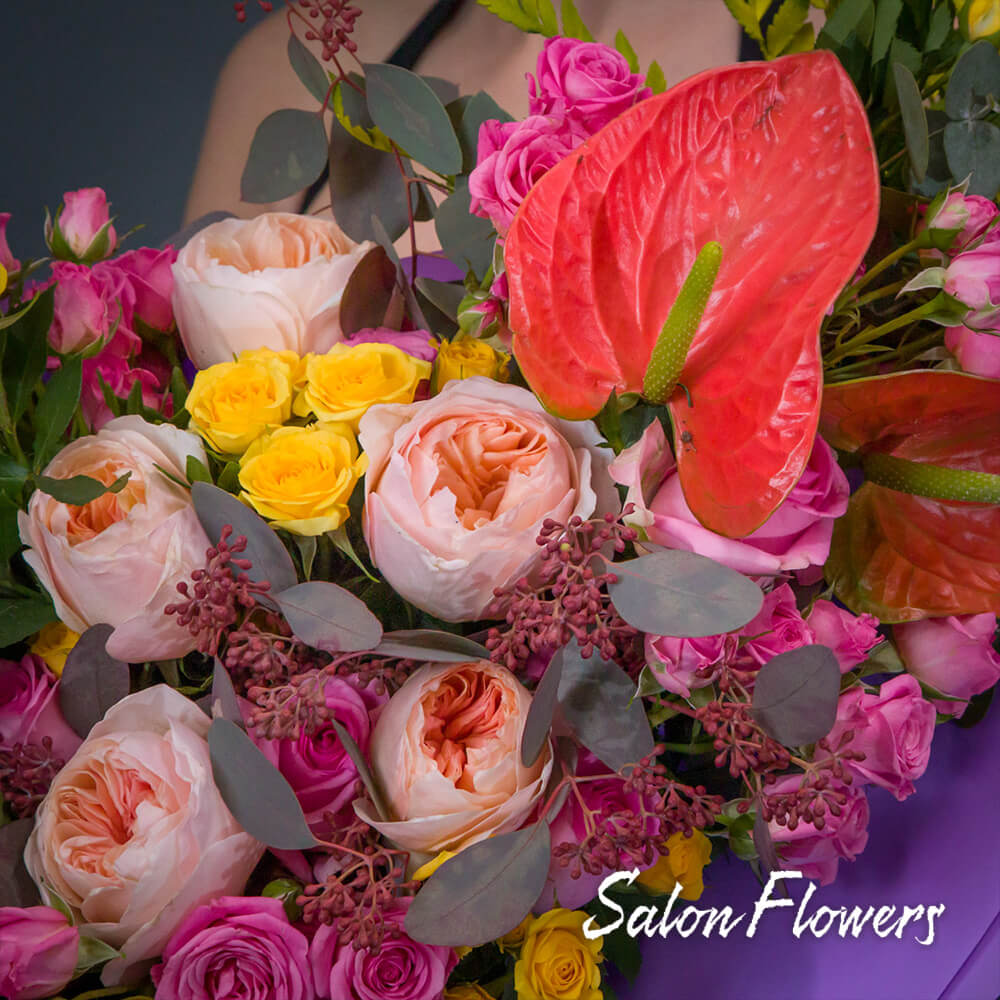 Роза «Джульетта» — 6 шт., роза кустовая розовая — 10 шт., роза кустовая желтая — 5 шт., антуриум розовый — 3 шт., эвкалипт, папоротник, зелень, фирменная упаковка, атласная лента.