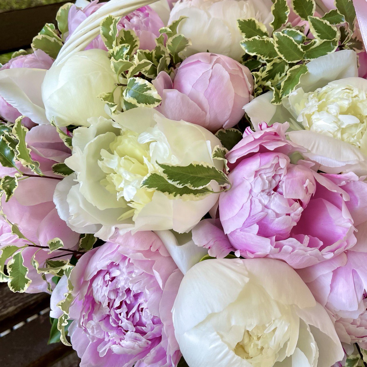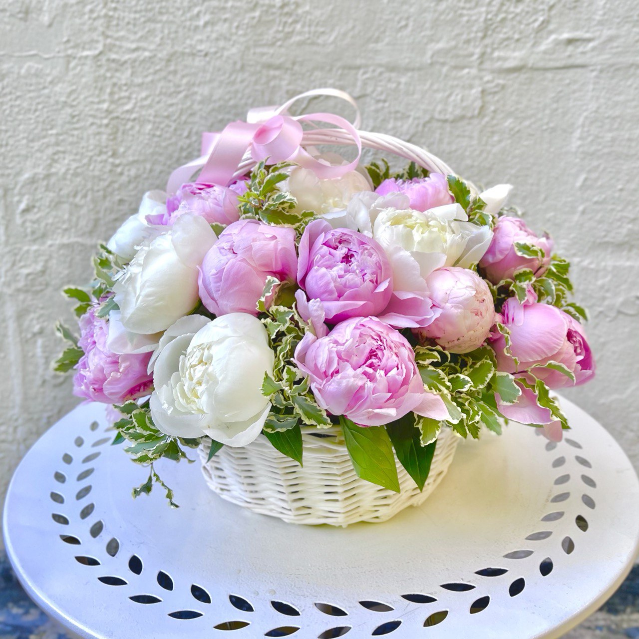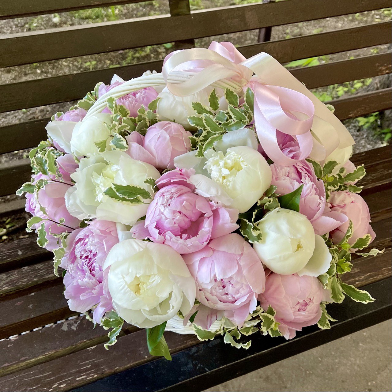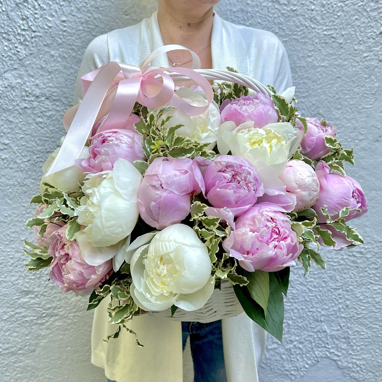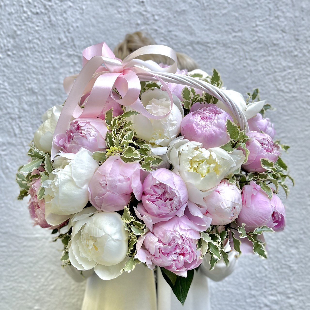 Пион розовый «Сара Бернар» — 19 шт., пион белый «Дюшес» — 10 шт., питтоспорум, корзина маленькая, флористическая губка, атласная лента.