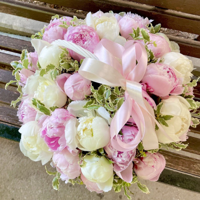 В композиции" Милас" собраны 29 пышных пионов, которые символизируют счастье, любовь и благополучие. Букет состоит из 19 розовых пионов сорта «Сара Бернар» и 10 белых пионов сорта «Дюшес».