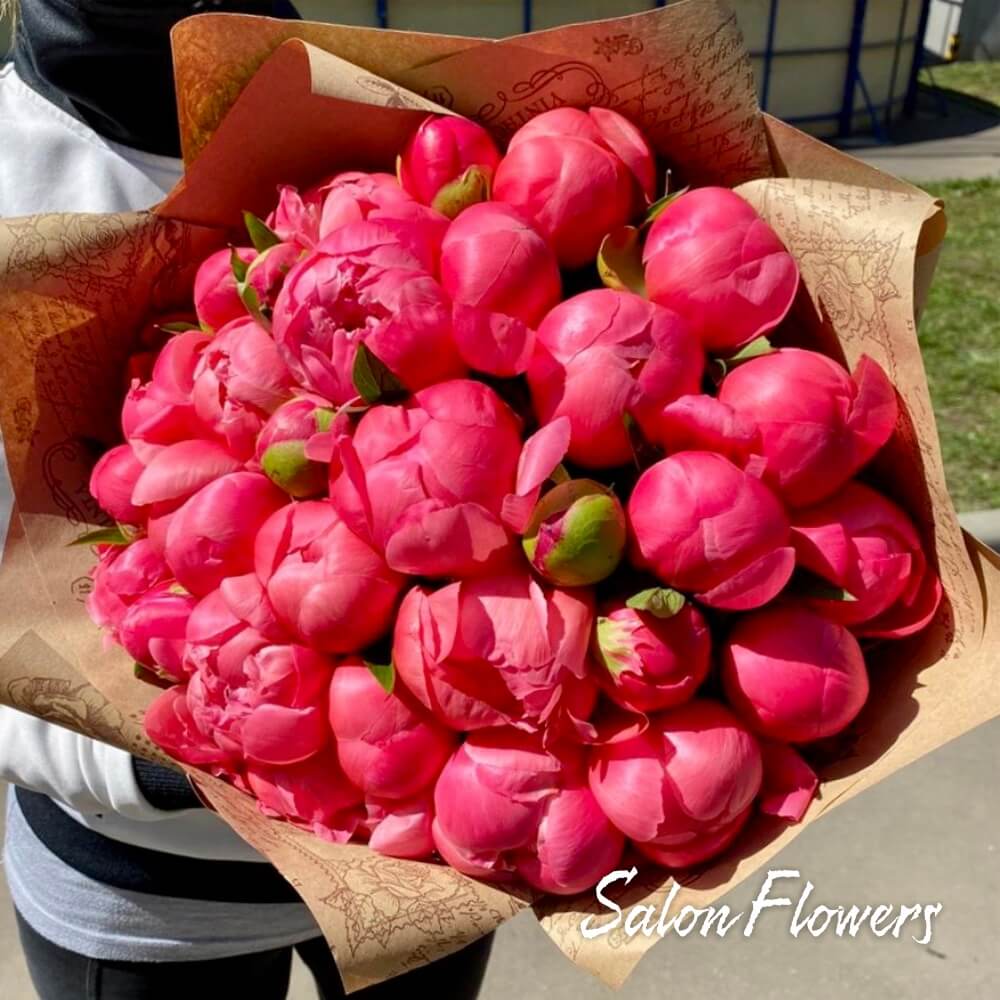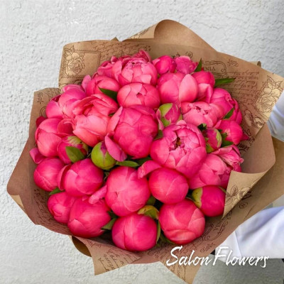 Пион «Корал Шарм» — 29 шт., фирменная упаковка, атласная лента.